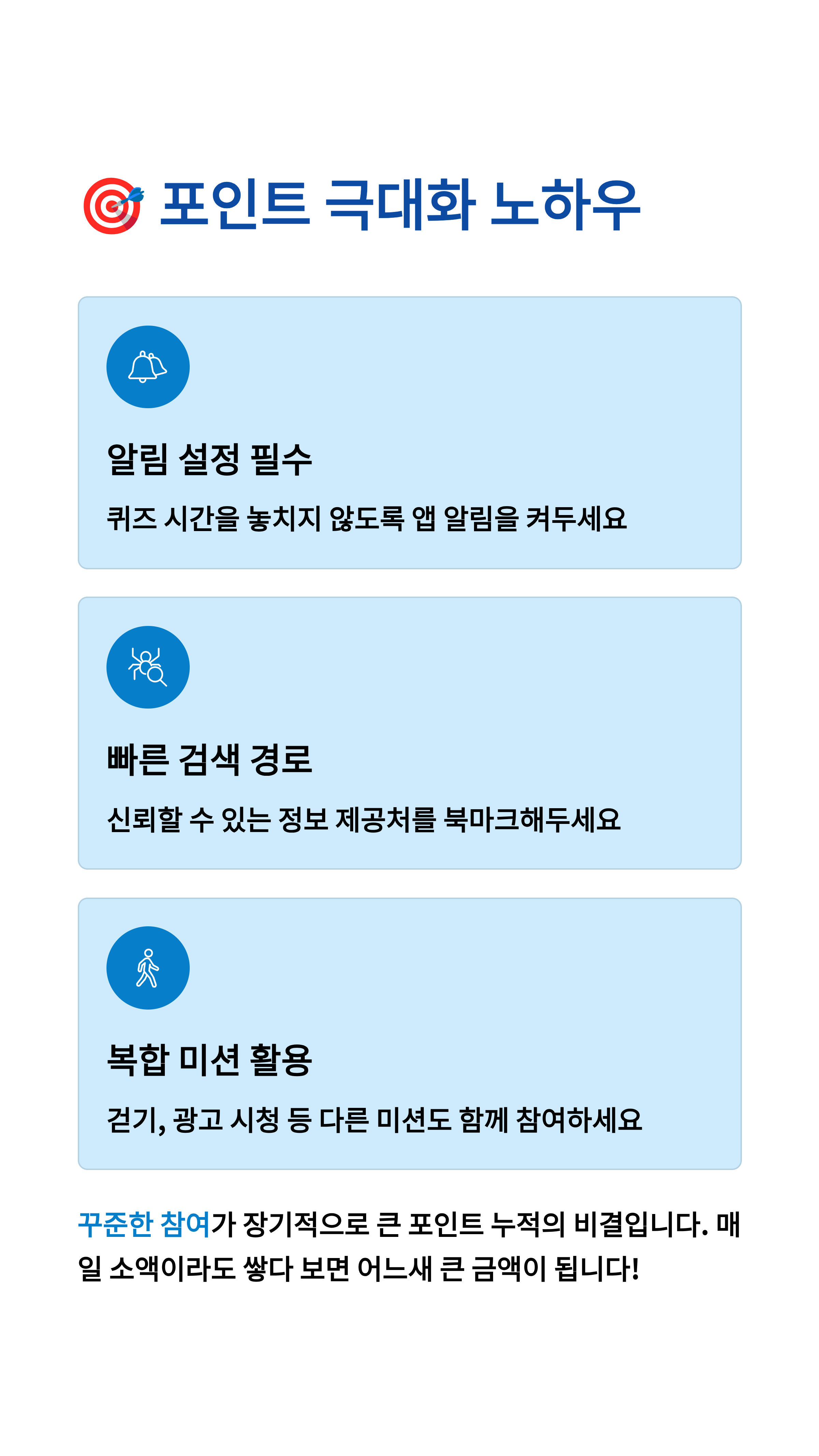 - 네 번째 핵심 포인트. 퀴즈뿐 아니라 걷기, 광고 참여 등 **다른 미션도 함께**하면 포인트가 빠르게 불어납니다.