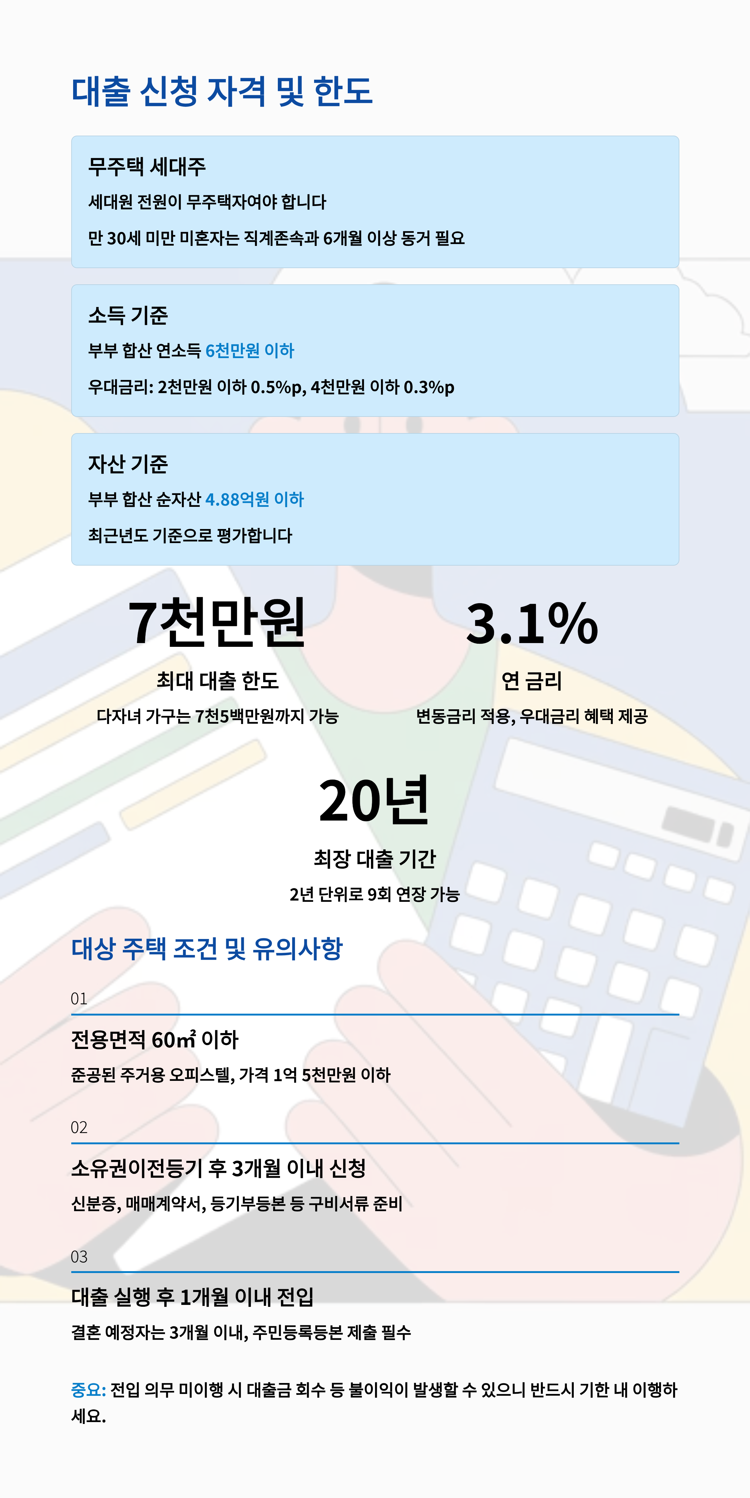 - **다섯 번째 핵심 포인트:** 대출 후 **1개월 이내 전입**이 필수 조건이며, 미이행 시 기한이익 상실 등의 불이익이 있을 수 있어요.