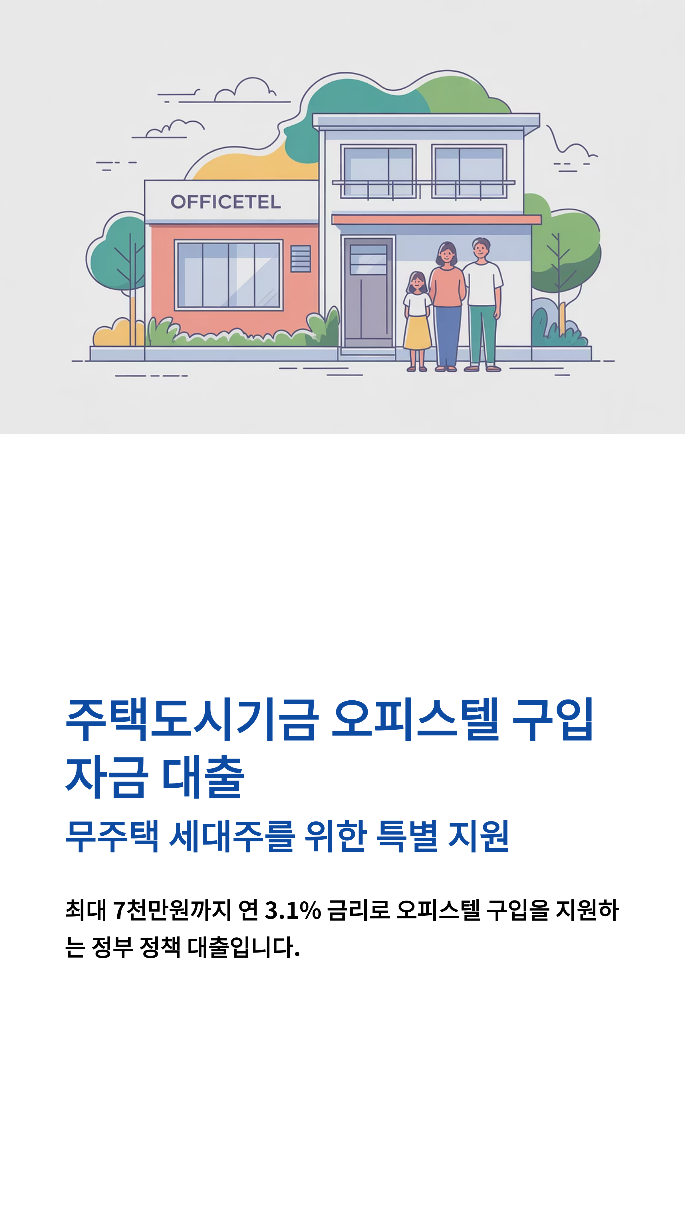 | **대출 한도** | 최대 7천만원 (다자녀 7천5백만원) 이내 | LTV, DTI 기준 적용 | 오피스텔 가격이 1.5억 초과 시 제외 |
