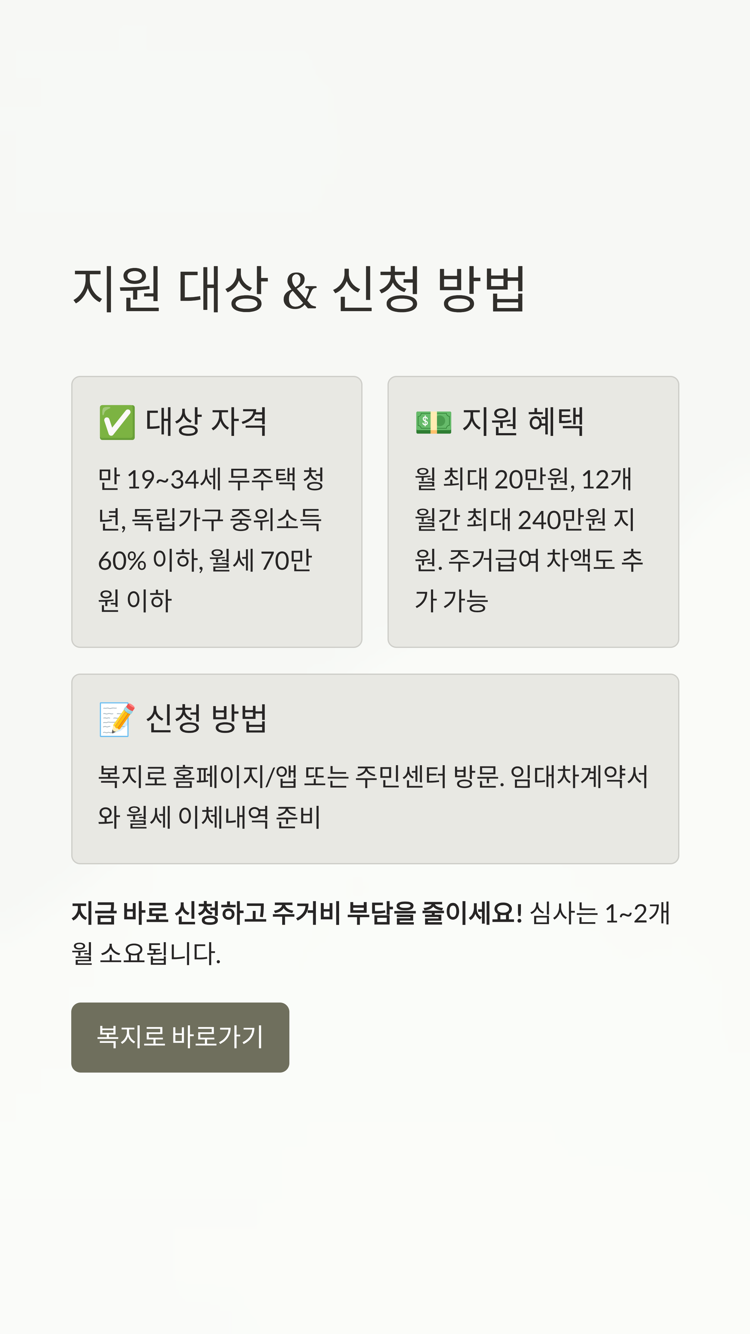 - 혜택: 연간 총 240만 원의 주거비 절감 성공!