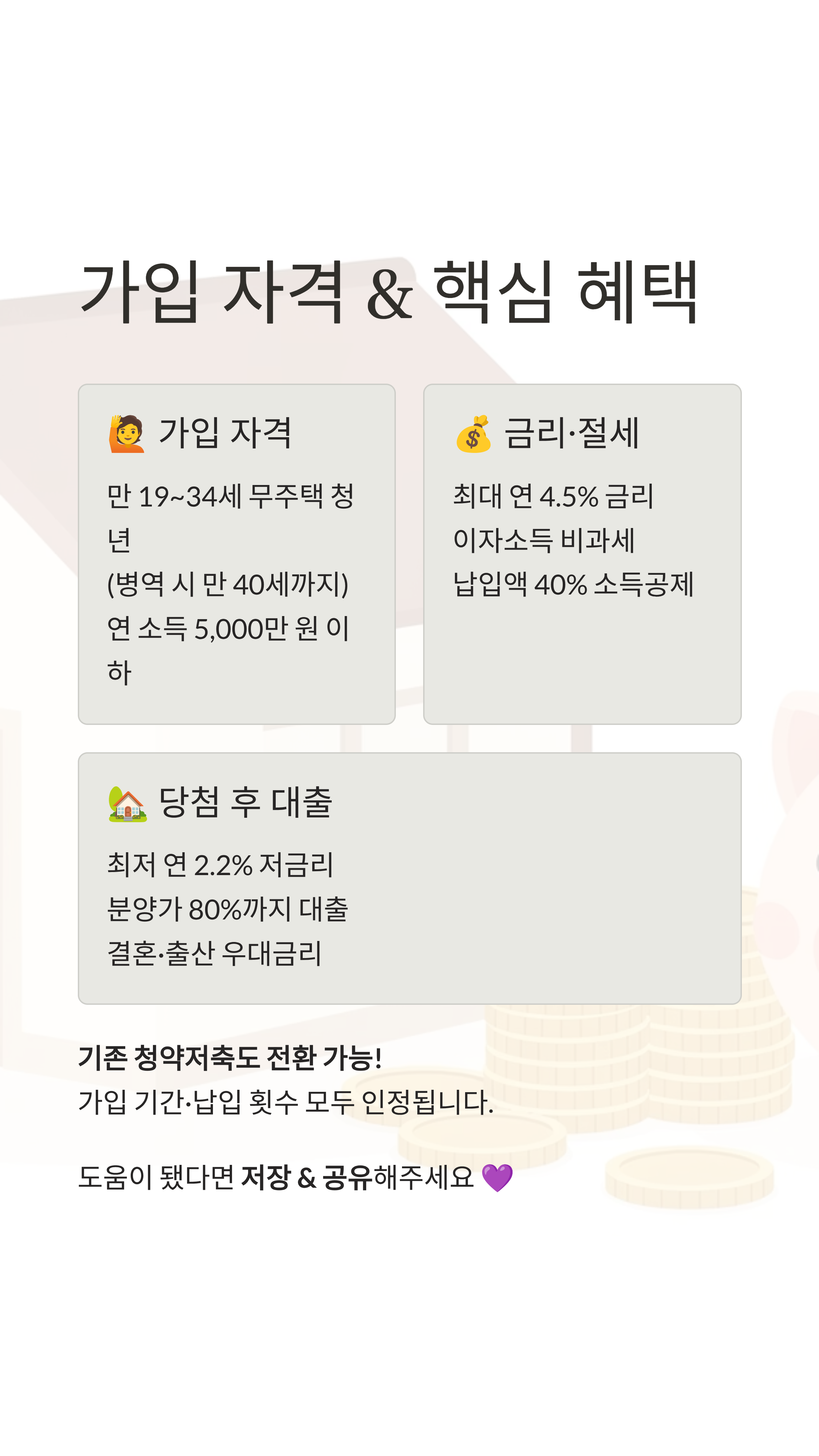 ✨ 가입 대상: 만 19~34세, 연소득 5천만 원 이하 무주택자라면 누구나 가능합니다.