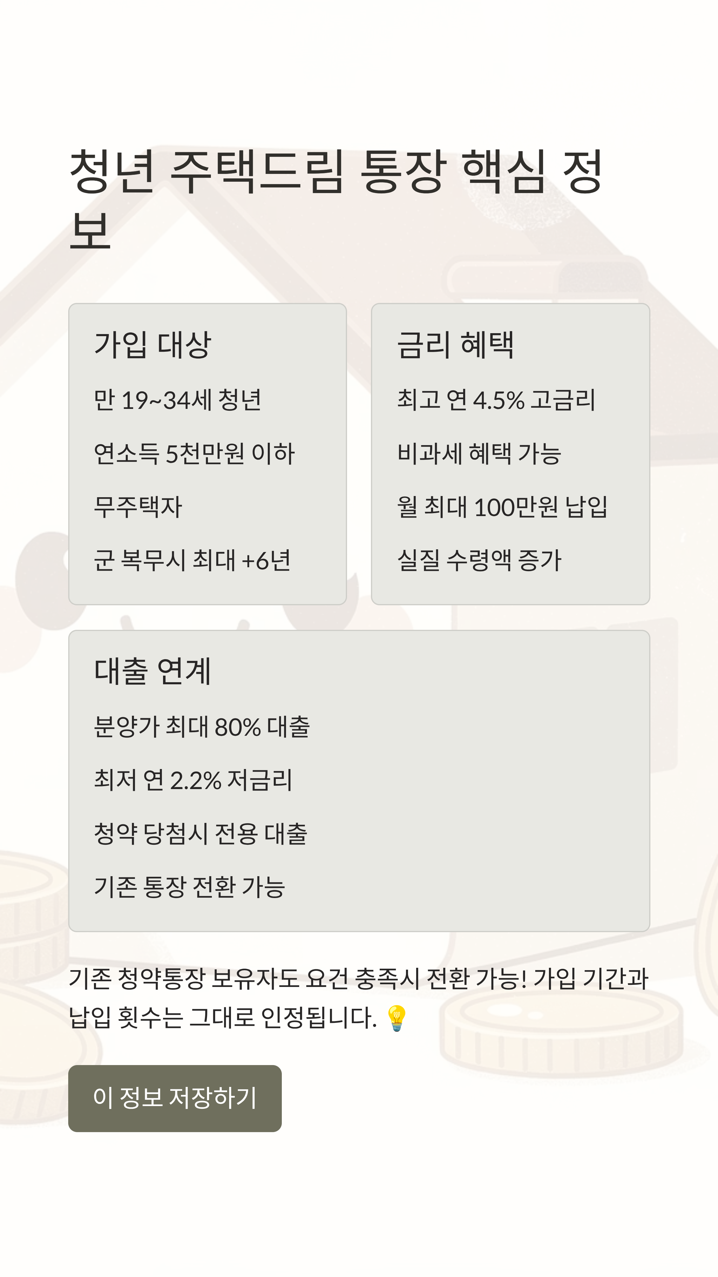 지금까지 청년 주택드림 청약통장에 대해 아주 자세히 알아봤습니다. 마지막으로 꼭 기억해야 할 5가지만 정리해 볼게요!