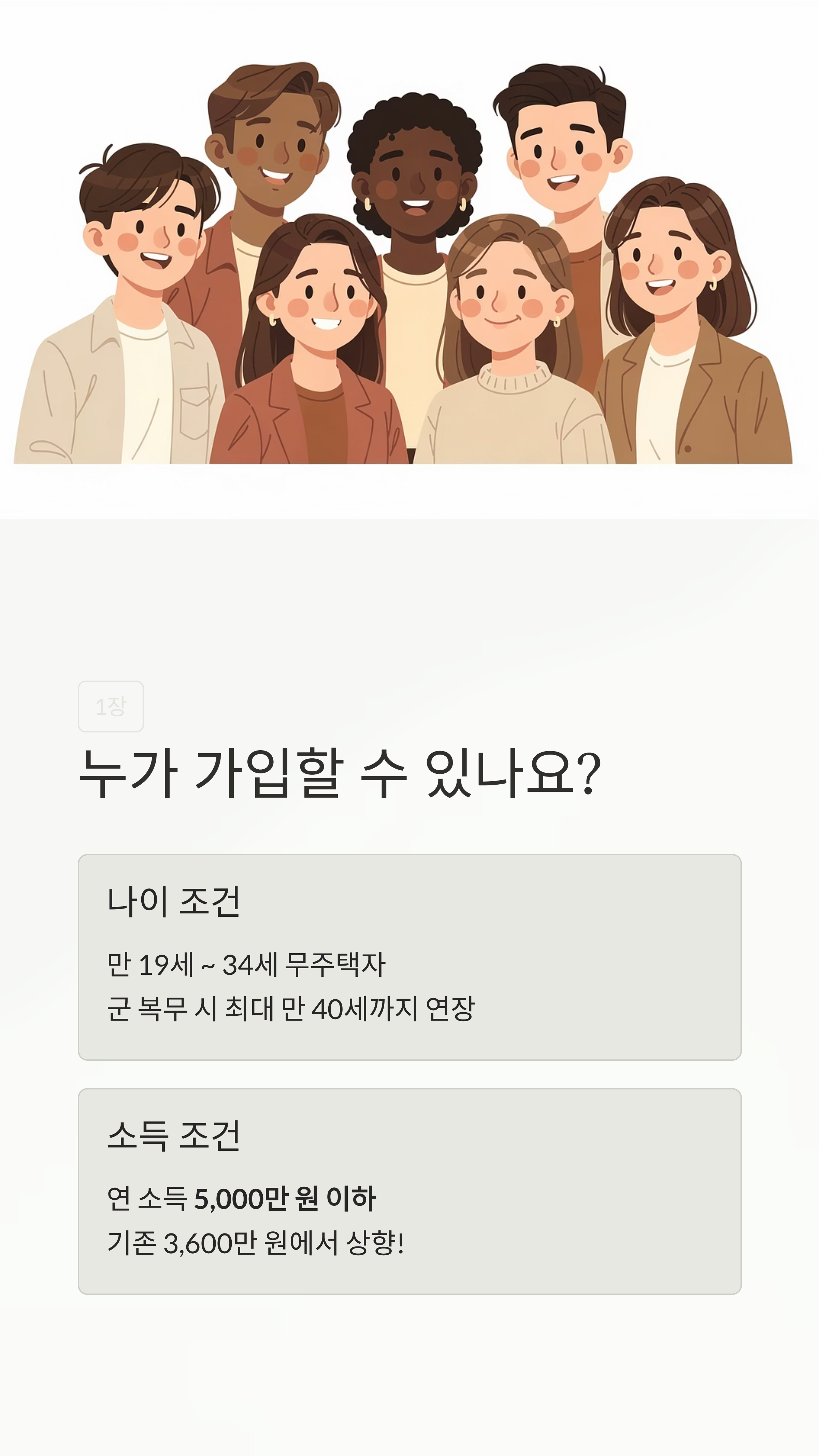 기본적으로 만 19세 이상에서 만 34세 이하의 무주택자라면 도전해 볼 수 있어요. 만약 군대를 다녀오셨다면 복무 기간만큼(최대 6년) 연령 제한이 늘어나니 만 40세까지도 가능하답니다! 군 복무 기간이 억울하지 않게 챙겨주는 센스, 아주 칭찬할 만하죠?