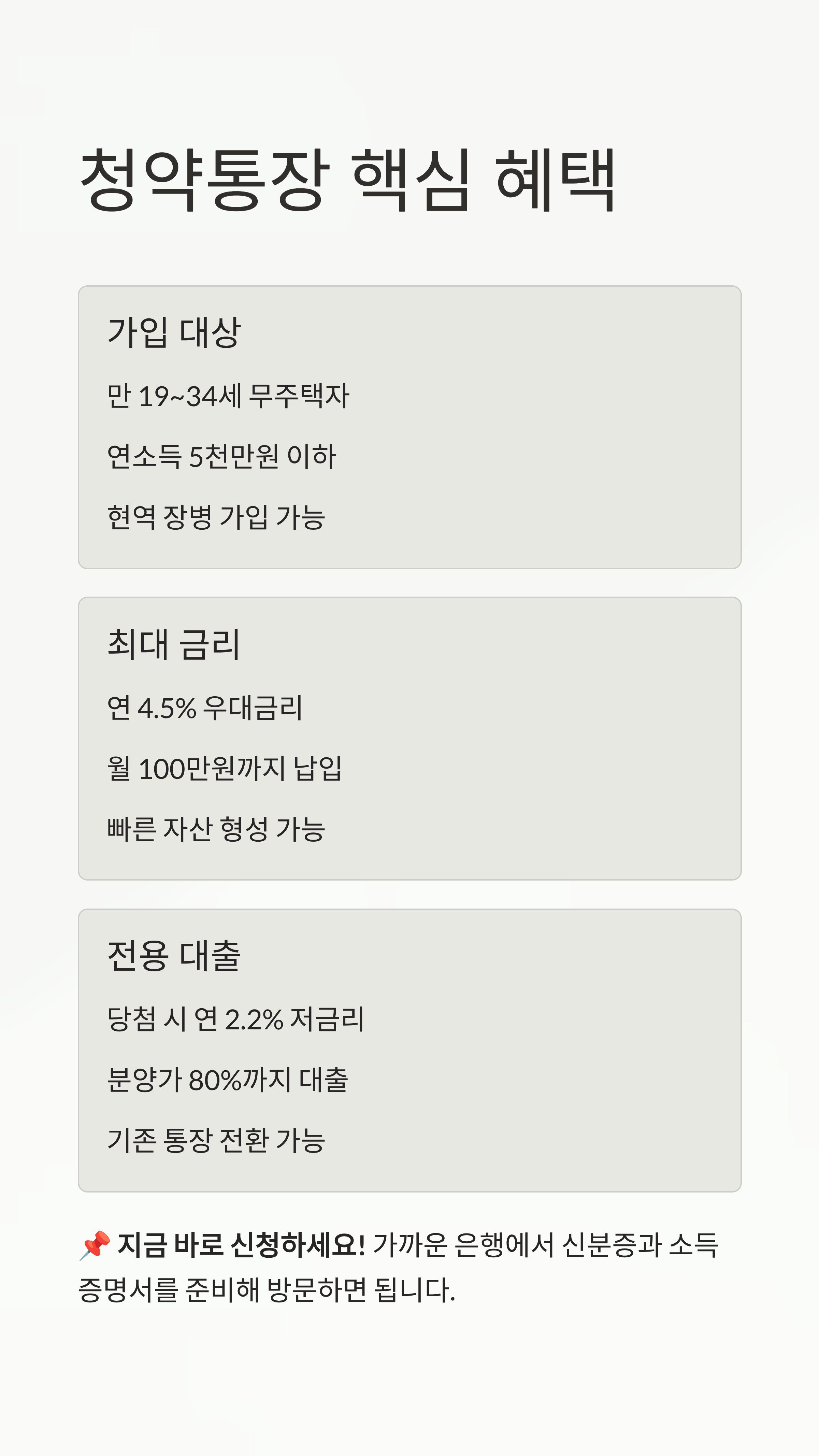 하지만 포기하기엔 일러요! 정부에서 청년들의 주거 안정을 위해 역대급 혜택을 담은 '청년 주택드림 청약통장'을 출시했거든요. 기존보다 가입 조건은 훨씬 완화됐는데, 이 통장 하나만 잘 굴려도 나중에 아파트 당첨됐을 때 연 2%대 저금리 대출까지 받을 수 있다는 사실, 알고 계셨나요? 오늘 제가 아주 쉽게 핵심만 쏙쏙 뽑아 설명해 드릴게요. 😊