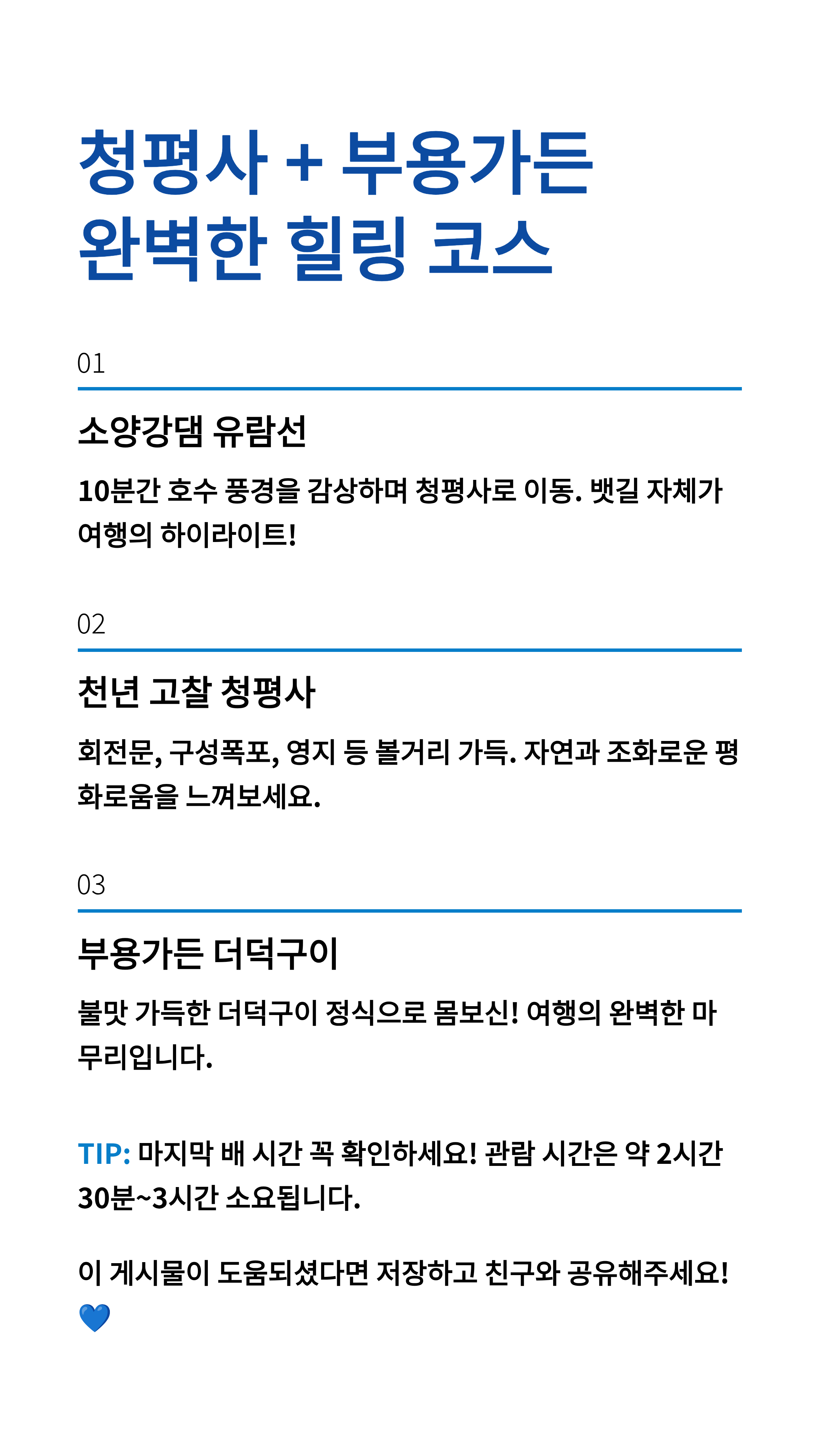 - **두 번째 핵심 포인트:** 청평사의 **회전문**과 **구성폭포**는 천년의 역사와 자연의 아름다움을 동시에 느낄 수 있는 하이라이트입니다.