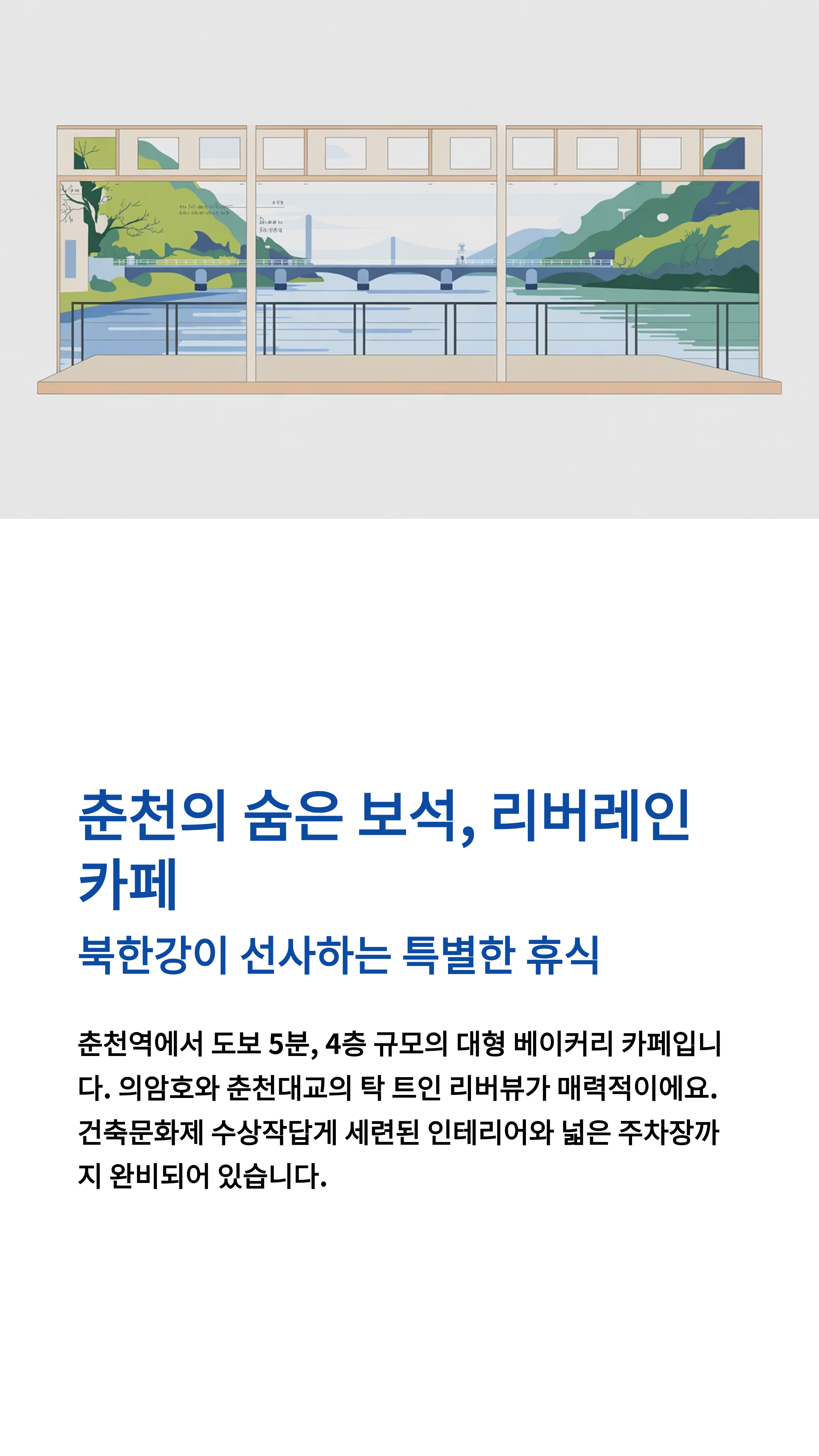 ✨ 첫 번째 핵심: 탁 트인 북한강, 춘천대교 리버뷰 맛집! 4층 규모의 대형 카페로 힐링하기 좋아요.
