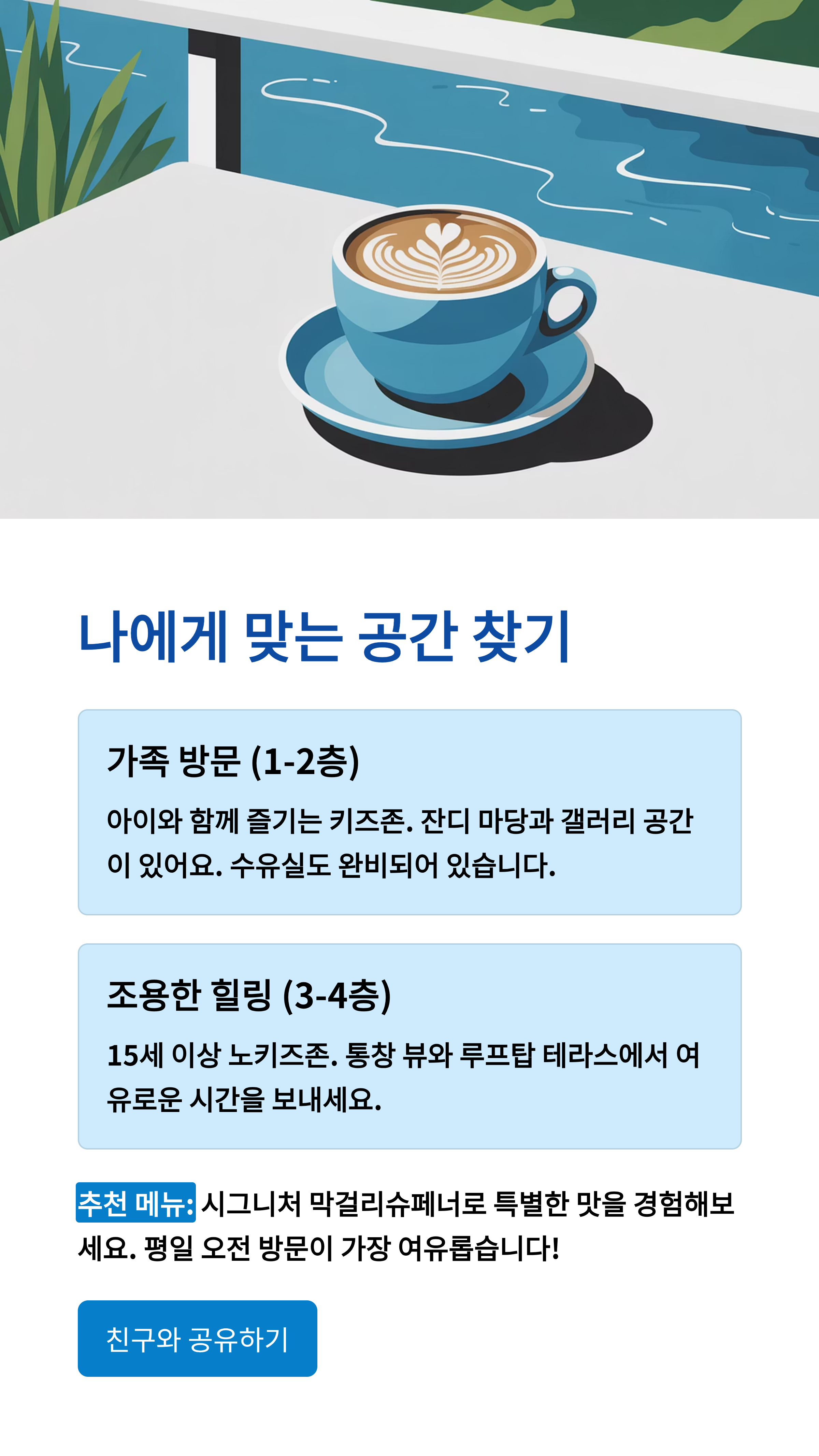 주말, 특히 **오후 2시부터 4시 사이**에는 방문객이 많아서 자리가 거의 꽉 찰 수 있거든요. 조용히 여유로운 시간을 즐기고 싶다면 **평일이나 이른 오전 시간대** 방문을 추천드려요! 3층과 4층은 노키즈존이니 아이와 함께라면 1~2층을 이용하셔야 해요.