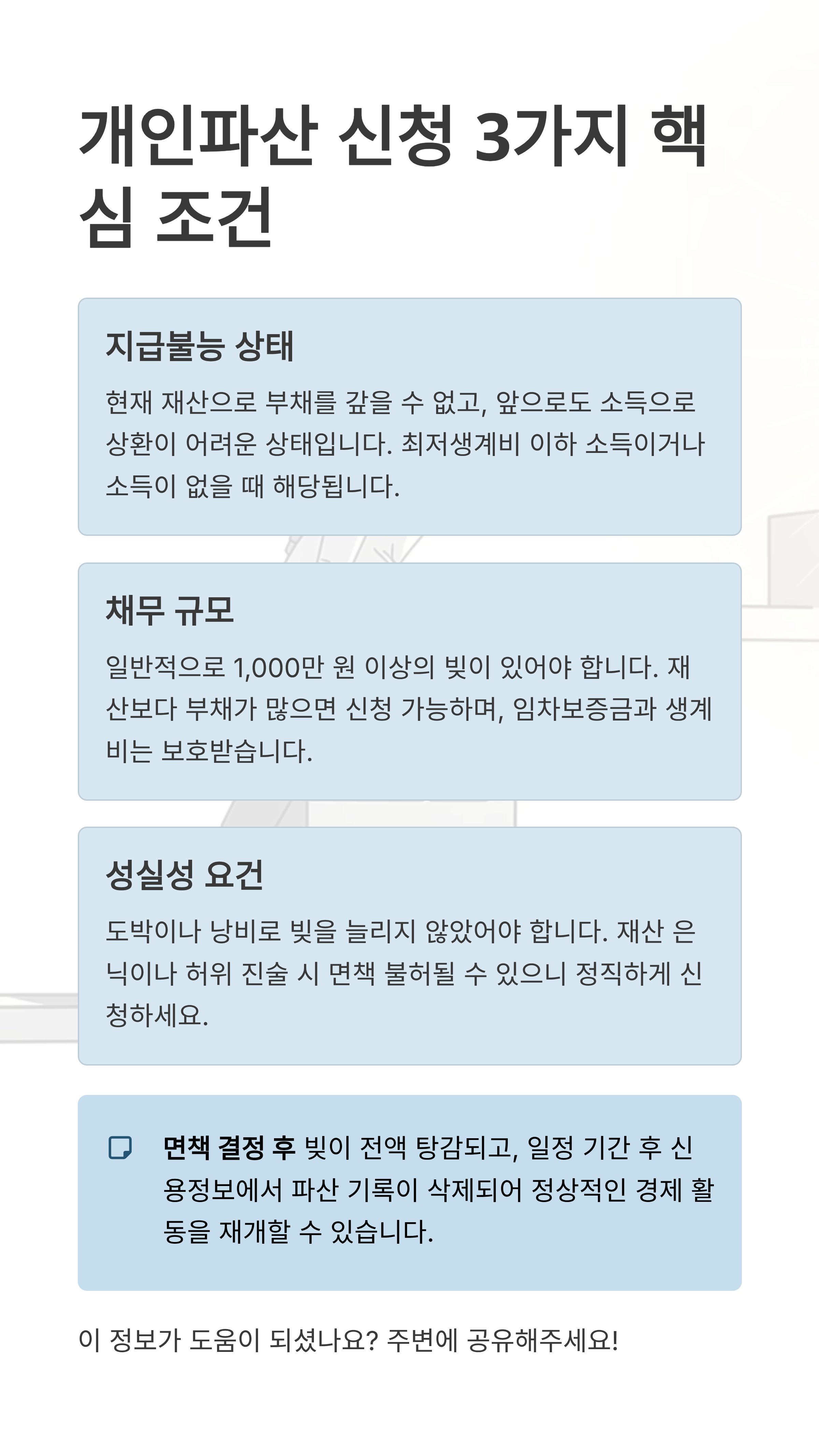 막막한 빚더미, 파산신청자격이 궁금하신가요? 개인파산 신청 시 가장 중요한 재산 한도와 부채 금액, 그리고 면책을 받기 위한 필수 조건들을 알기 쉽게 정리해 드립니다. 2026년 최신 기준을 반영하여 당신의 새로운 시작을 돕는 가이드가 되어 드릴게요!