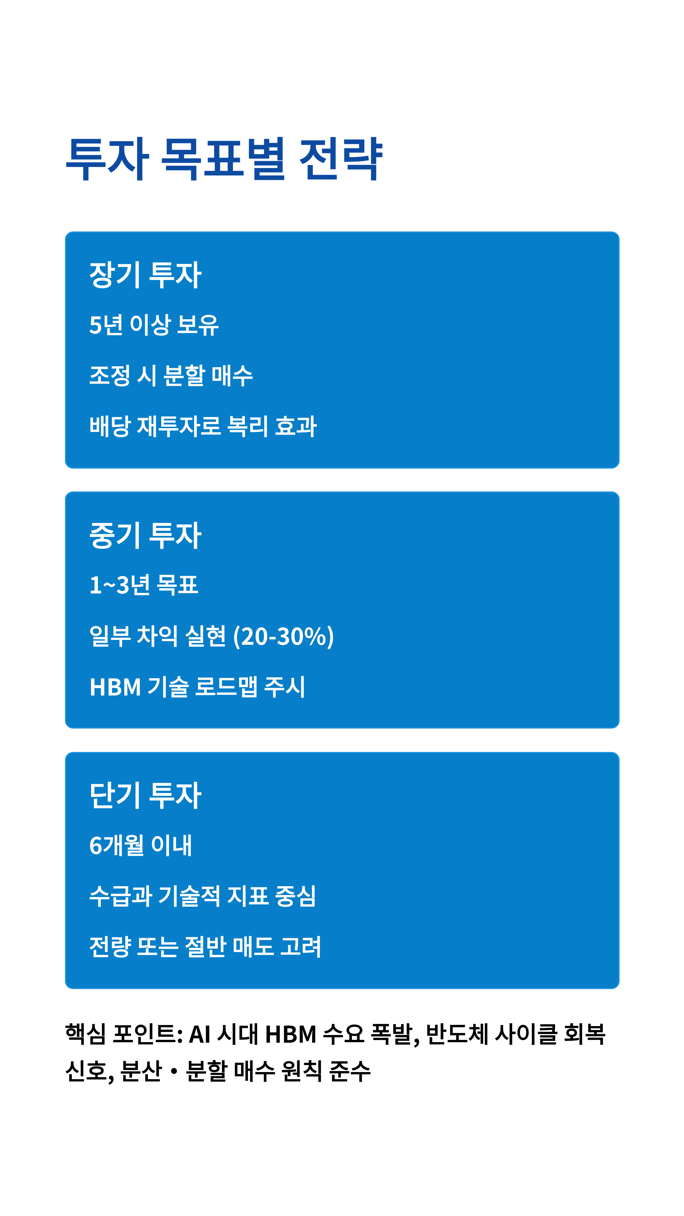 | 항목 2: 중기 투자 (1~3년) | 항목 2에 대한 설명: 다음 반도체 사이클 고점에서의 차익 실현 | 추가 정보: 일부 (20~30%) **차익 실현** 후 현금 확보 또는 재투자 | 기타 데이터: **HBM3E, HBM4** 개발 일정 등 기술 로드맵 주시 |