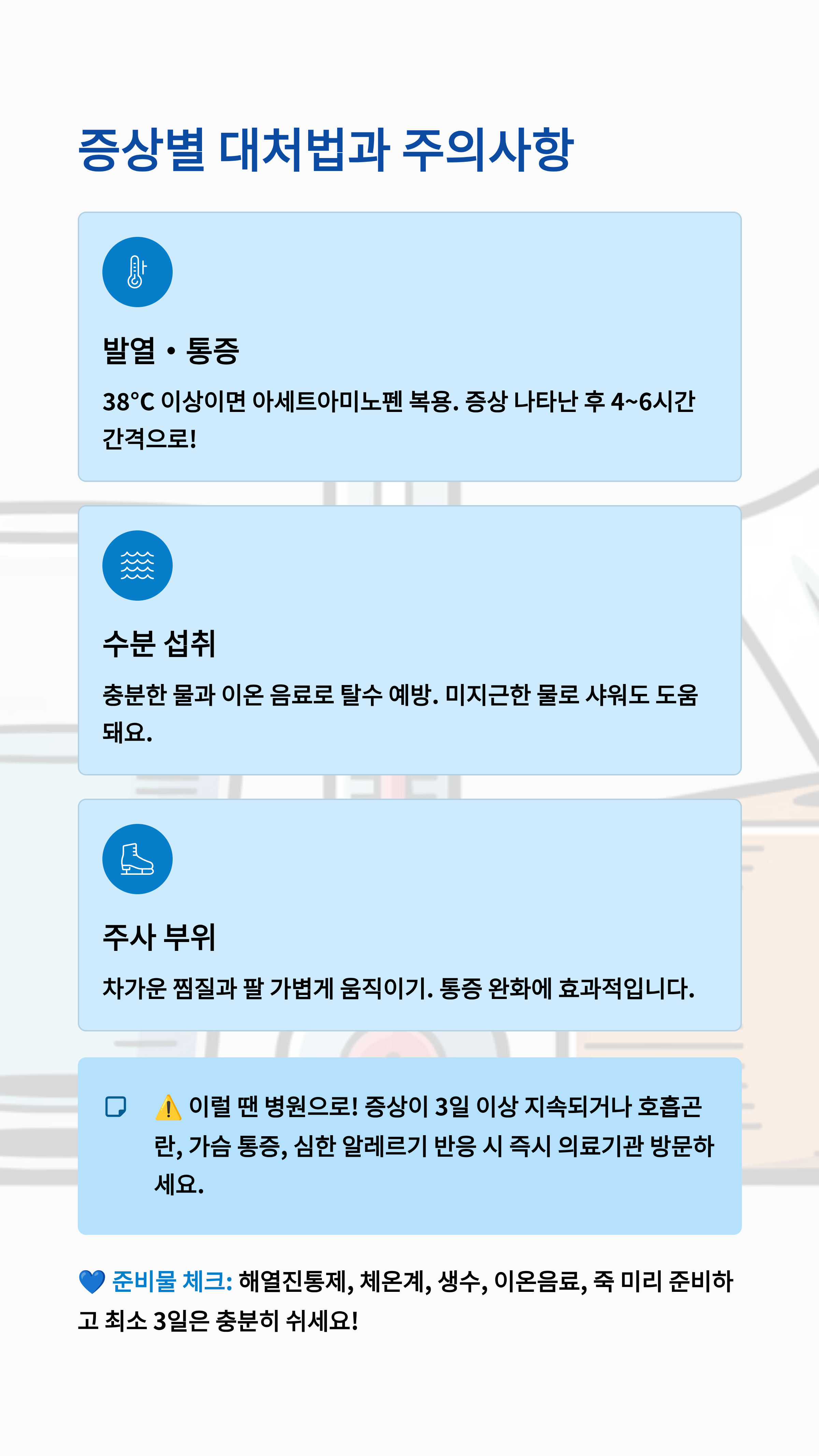 **네 번째 핵심 포인트.** 접종 다음날은 **모든 일정을 비우고** 비상 식량, 의약품을 미리 준비해 두는 것이 좋습니다.