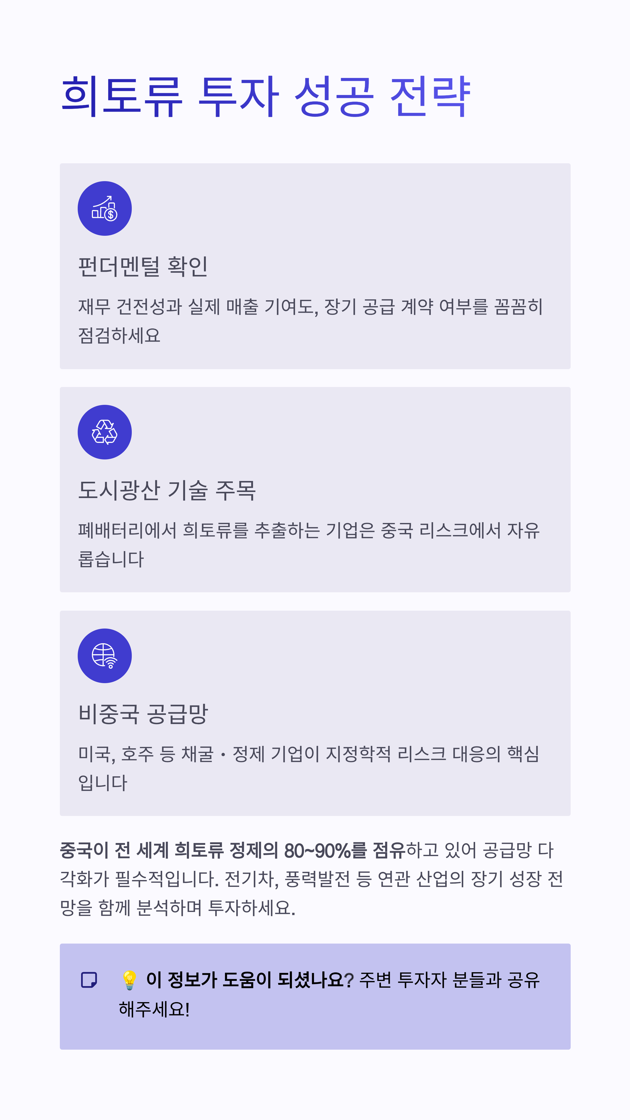 3. **세 번째 핵심 포인트:** 투자 관점에서 중요한 것은 **비중국 공급망 다각화**에 실질적으로 기여하는 기업이나 **도시 광산 기술력**을 가진 기업입니다.