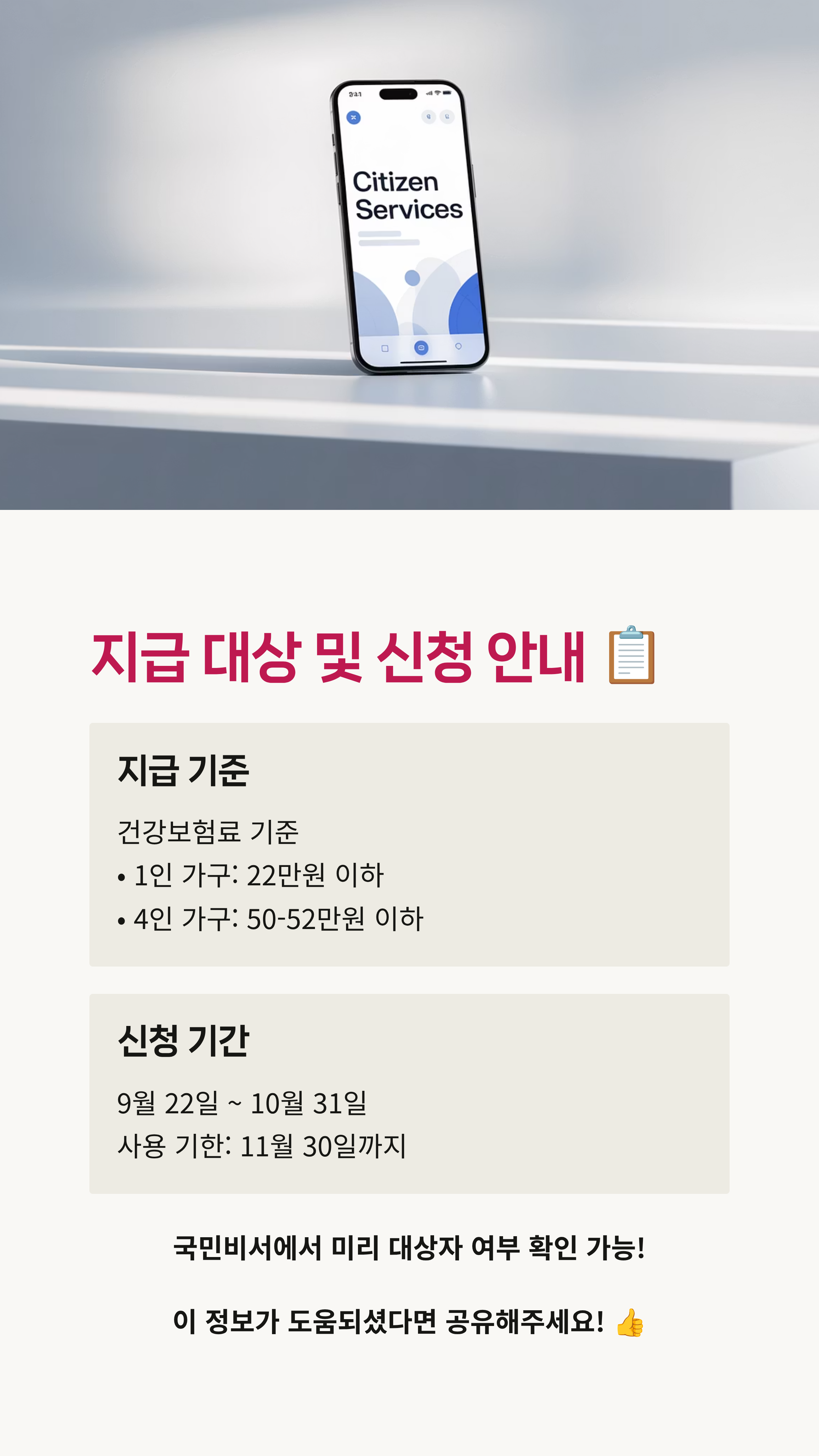첫 번째는 고액 자산가 제외 기준이고, 두 번째는 건강보험료 납부액 기준이에요. 대부분의 국민은 건강보험료를 기준으로 판단하게 되는데요, 이 두 가지 기준을 모두 충족해야만 소비쿠폰을 받을 수 있답니다.