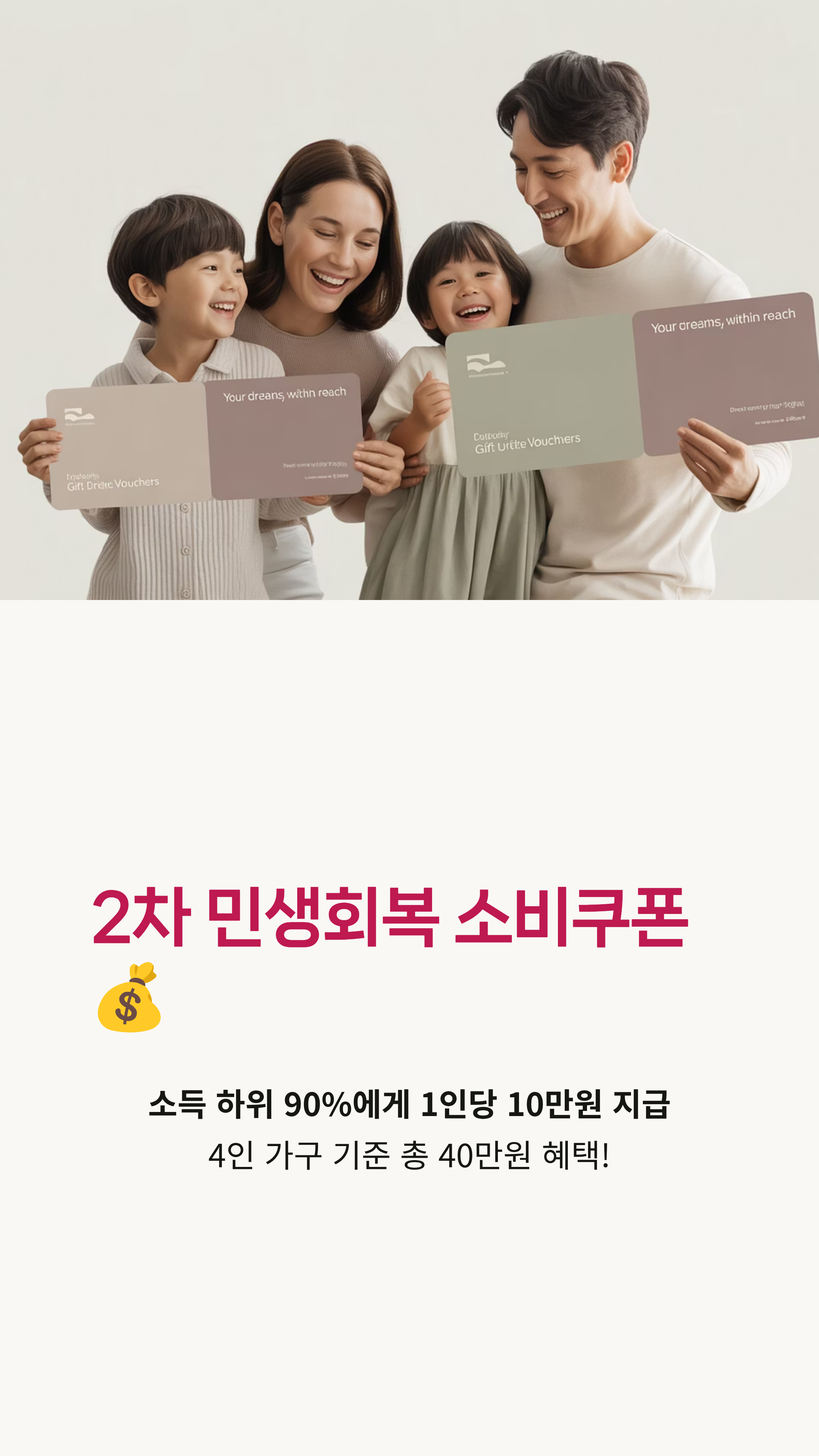 소비쿠폰은 세대주 단위가 아니라, 국민 개인별로 10만 원씩 지급된다는 점! 4인 가구라면 총 40만 원의 혜택을 받을 수 있다는 뜻이죠. 정말 쏠쏠하죠?