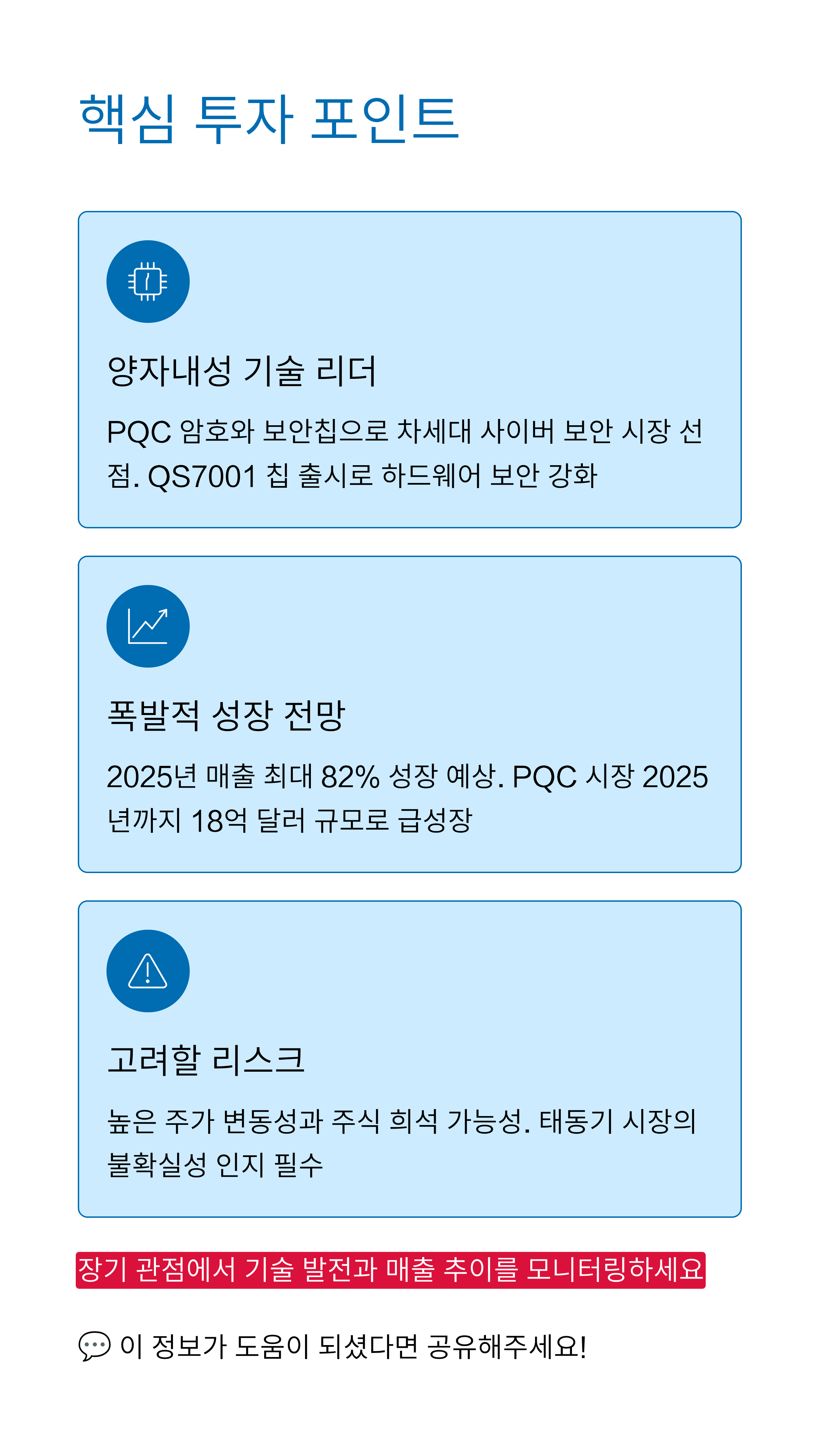 - **세 번째 핵심 포인트: 높은 성장 잠재력과 변동성.** PQC 시장의 폭발적인 성장이 예상되지만, **주식 희석** 등의 리스크로 인해 주가 변동성이 매우 크다는 점을 항상 기억해야 합니다.