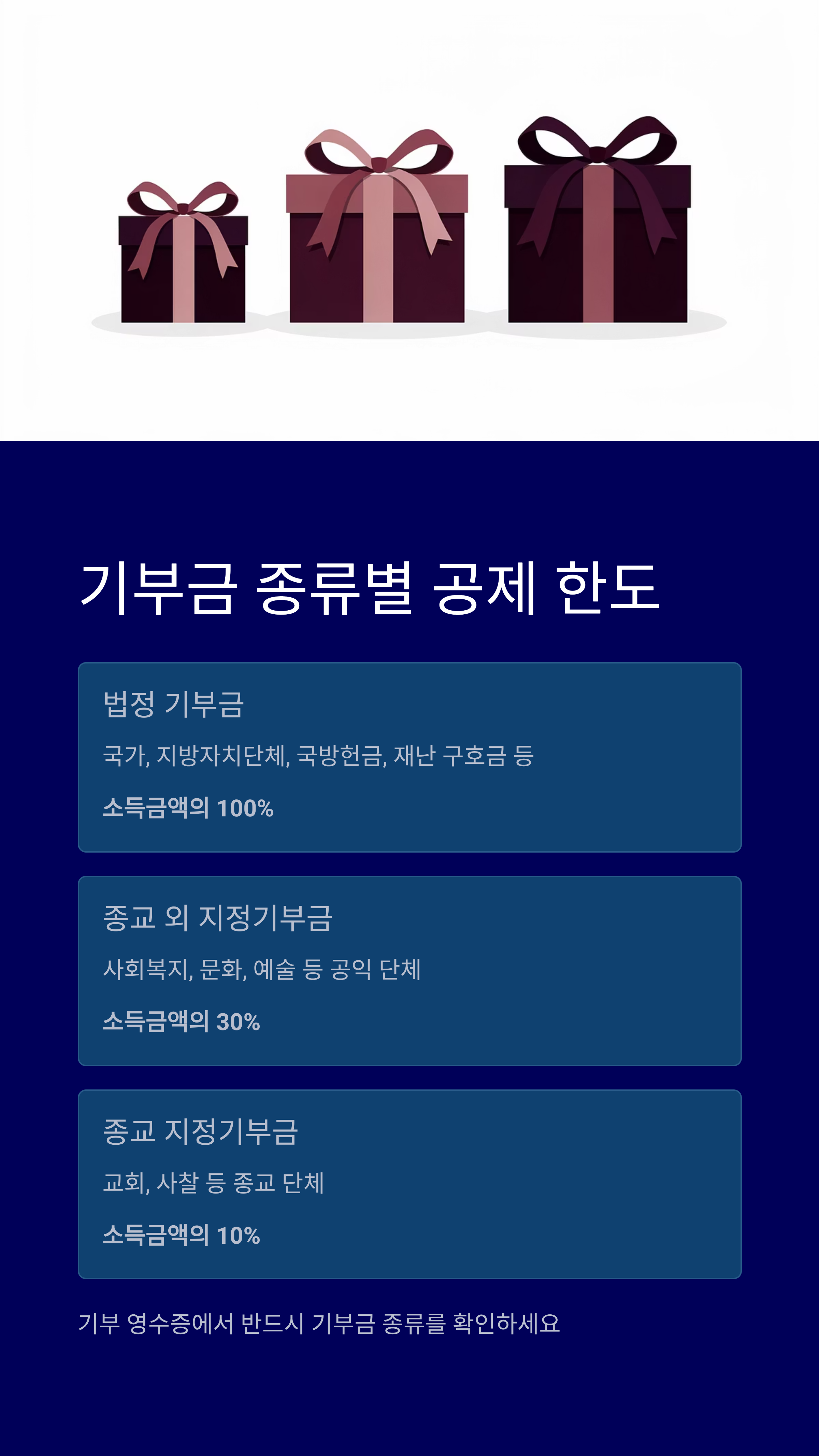 | **종교 지정 기부금** | 소득 금액의 **10%** | 정치자금 기부금은 별도 | 교회, 사찰 등 종교단체 |