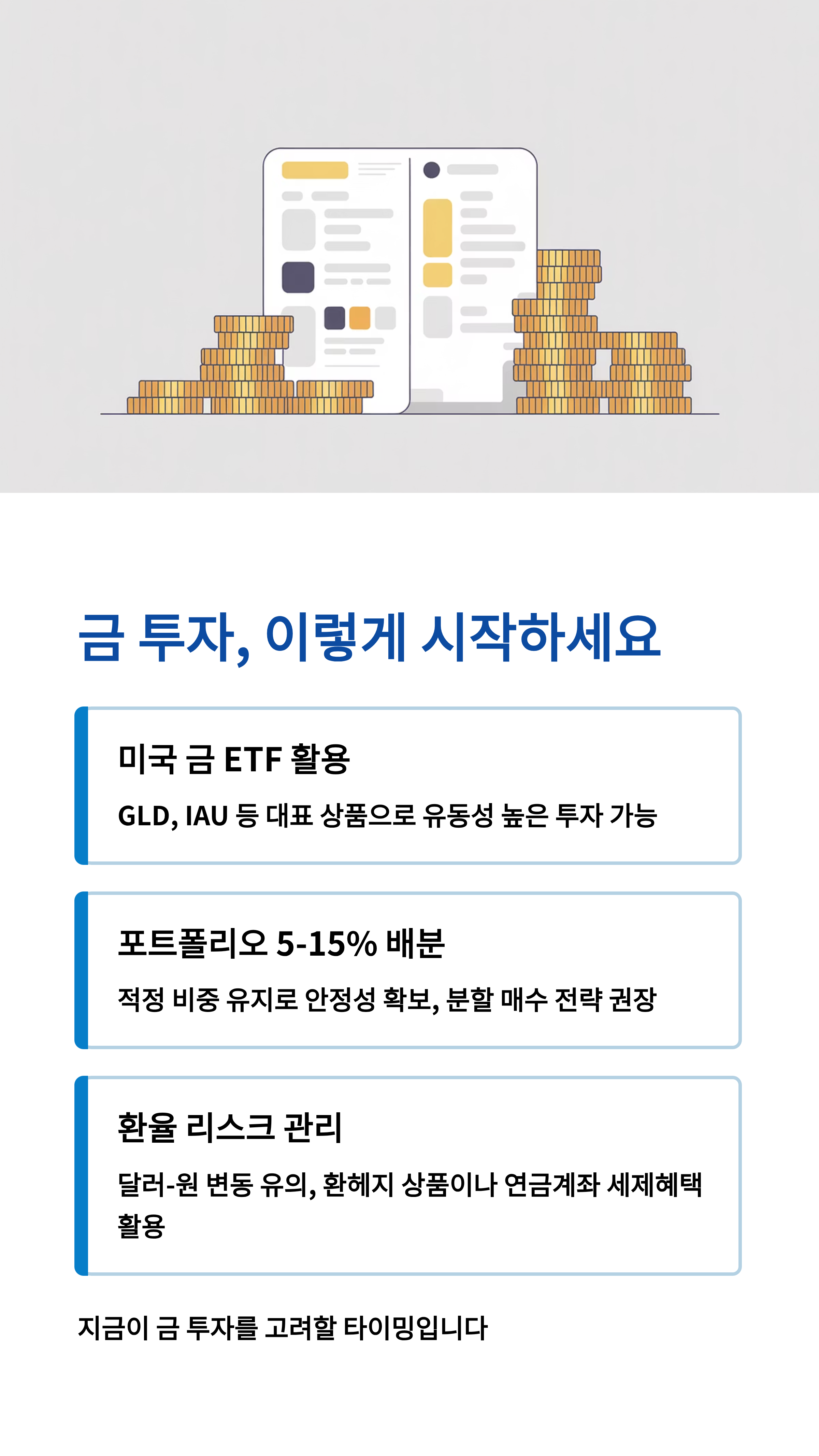 4. 네 번째 핵심 포인트. 금 투자는 **전체 자산의 5%~15%** 내외로 비중을 제한하고, **분할 매수**를 통해 가격 변동 리스크를 관리하는 것이 중요합니다.