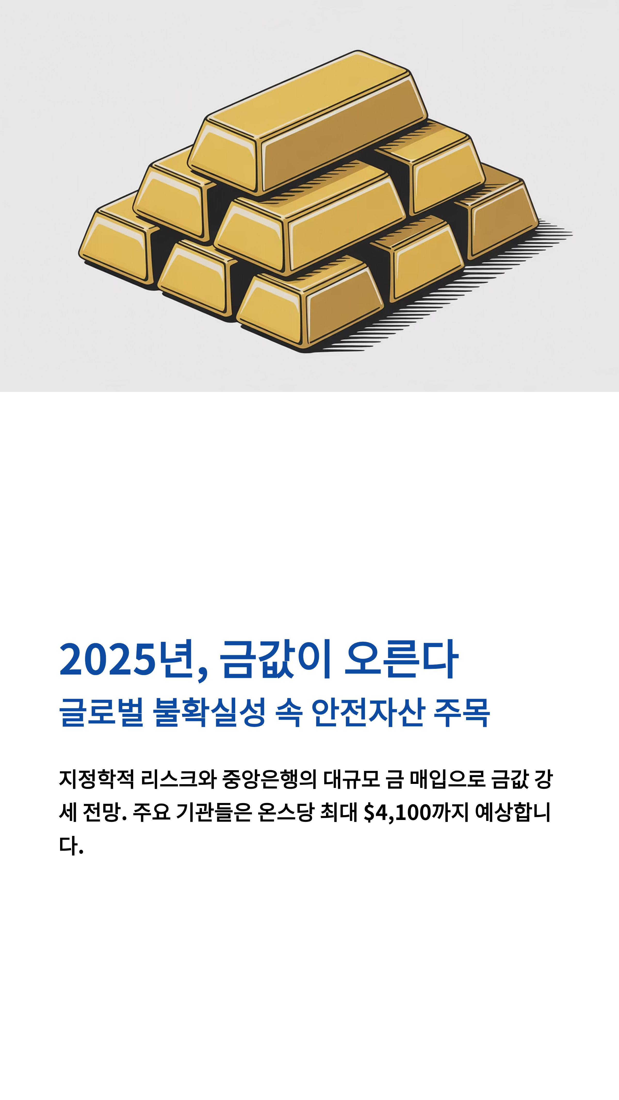 2025년 금값은 글로벌 불확실성과 중앙은행의 매입 증가, 그리고 통화 정책 변화에 힘입어 장기적인 상승세를 이어갈 것으로 전망됩니다. 현명한 투자자라면 지금이야말로 금을 포트폴리오에 편입할 최적의 시점일 수 있죠. 오늘 배운 핵심 내용을 다시 한번 정리해 볼까요?