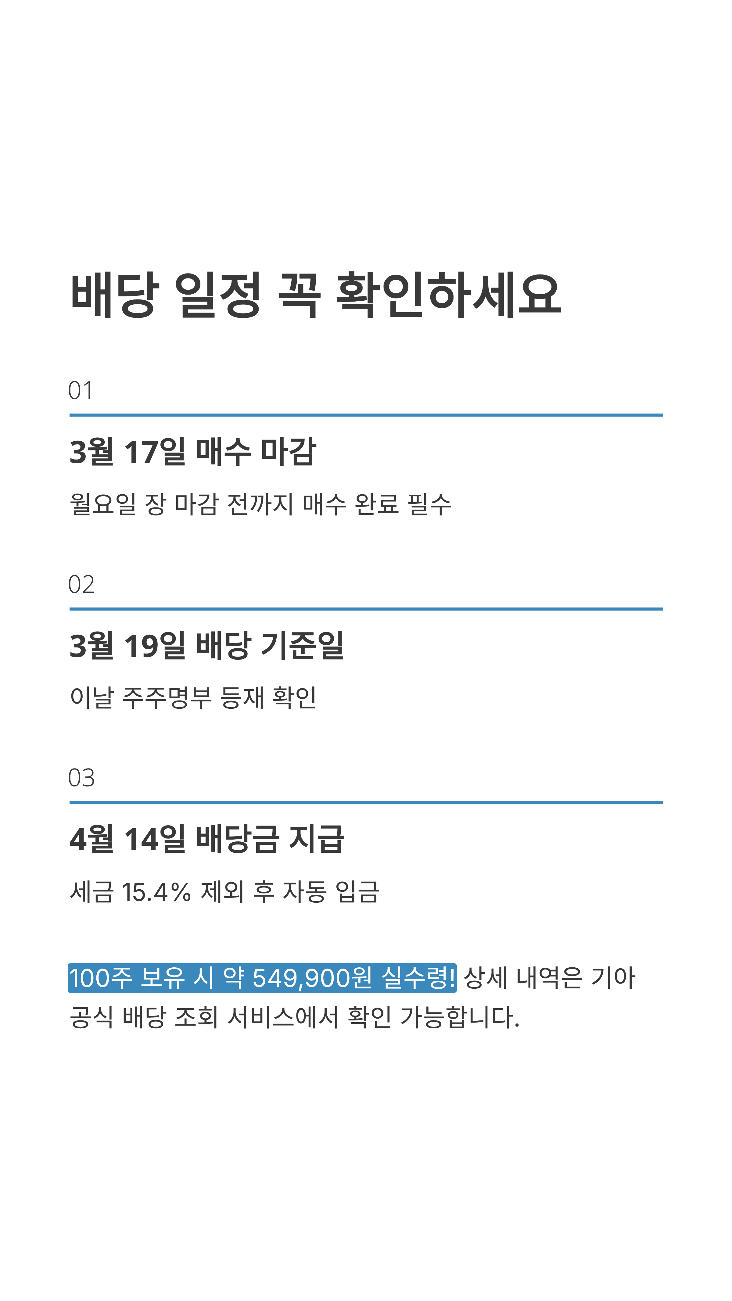 배당을 받기 위해서는 정해진 날짜에 주식을 보유하고 있어야 합니다. 이번 기아의 배당 일정은 다음과 같습니다. 배당 기준일이 3월 19일이라는 점을 꼭 기억하세요!