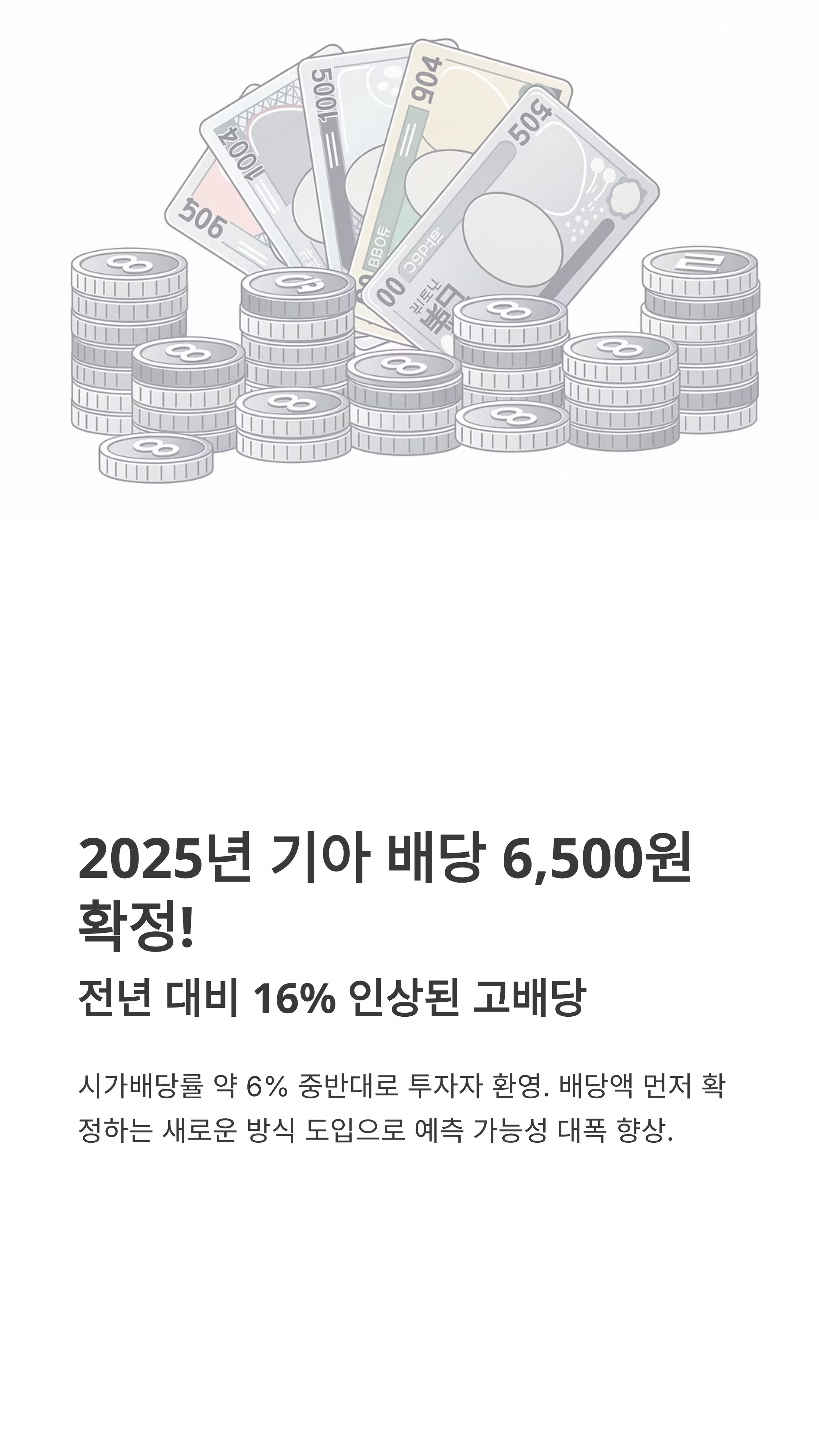 기아는 최근 '선(先) 배당액 확정, 후(後) 배당기준일 설정' 방식을 도입했습니다. 과거에는 연말에 주식을 사야 배당을 줬지만, 이제는 배당금이 얼마인지 먼저 공시를 하고 나서 기준일을 정하기 때문에 투자자들이 수익률을 계산하고 들어오기에 훨씬 유리해졌답니다.