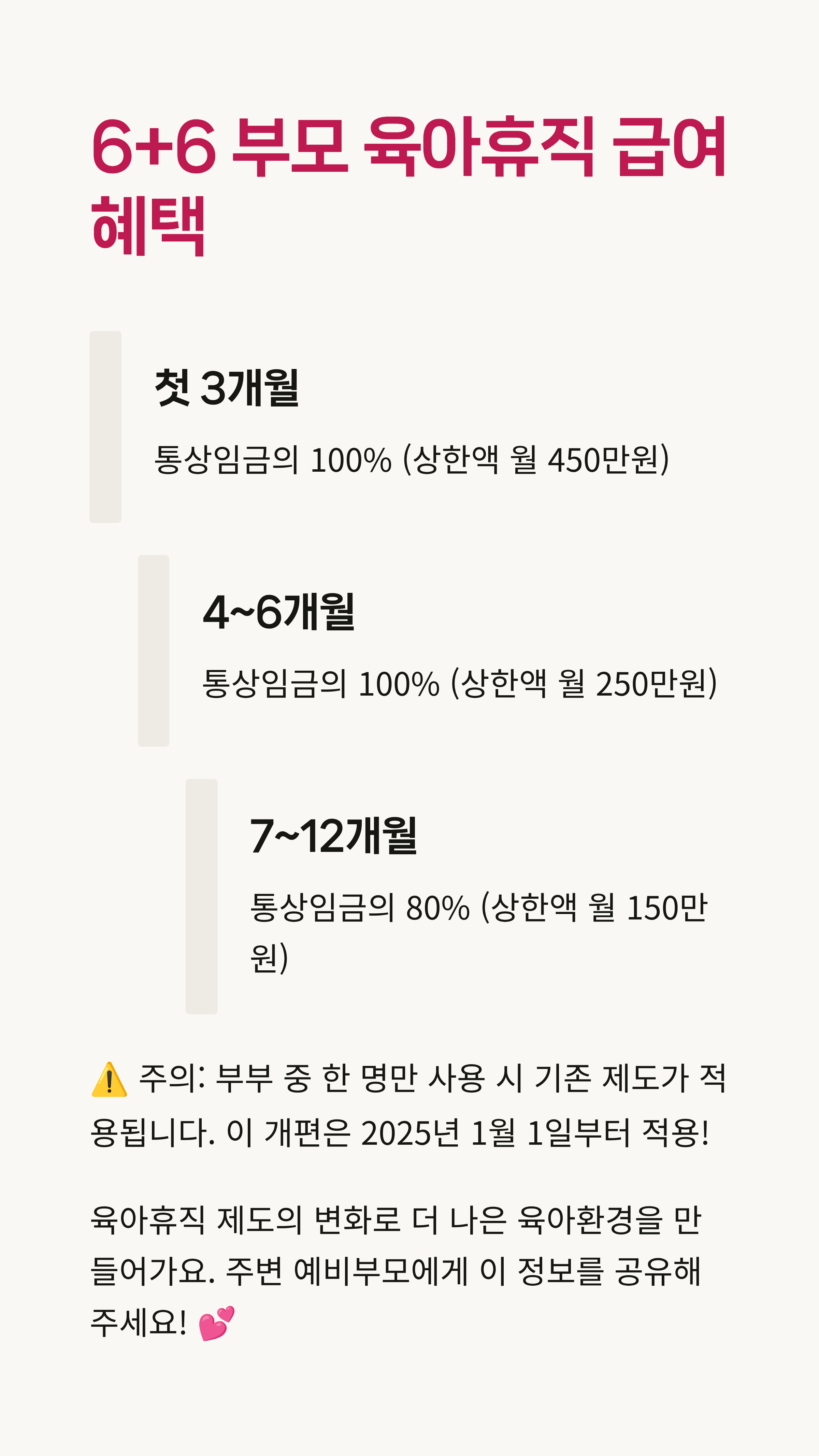 5. 달라진 제도는 2025년 1월 1일 이후 육아휴직 시작자부터 적용되니, 시기를 꼭 확인하세요.