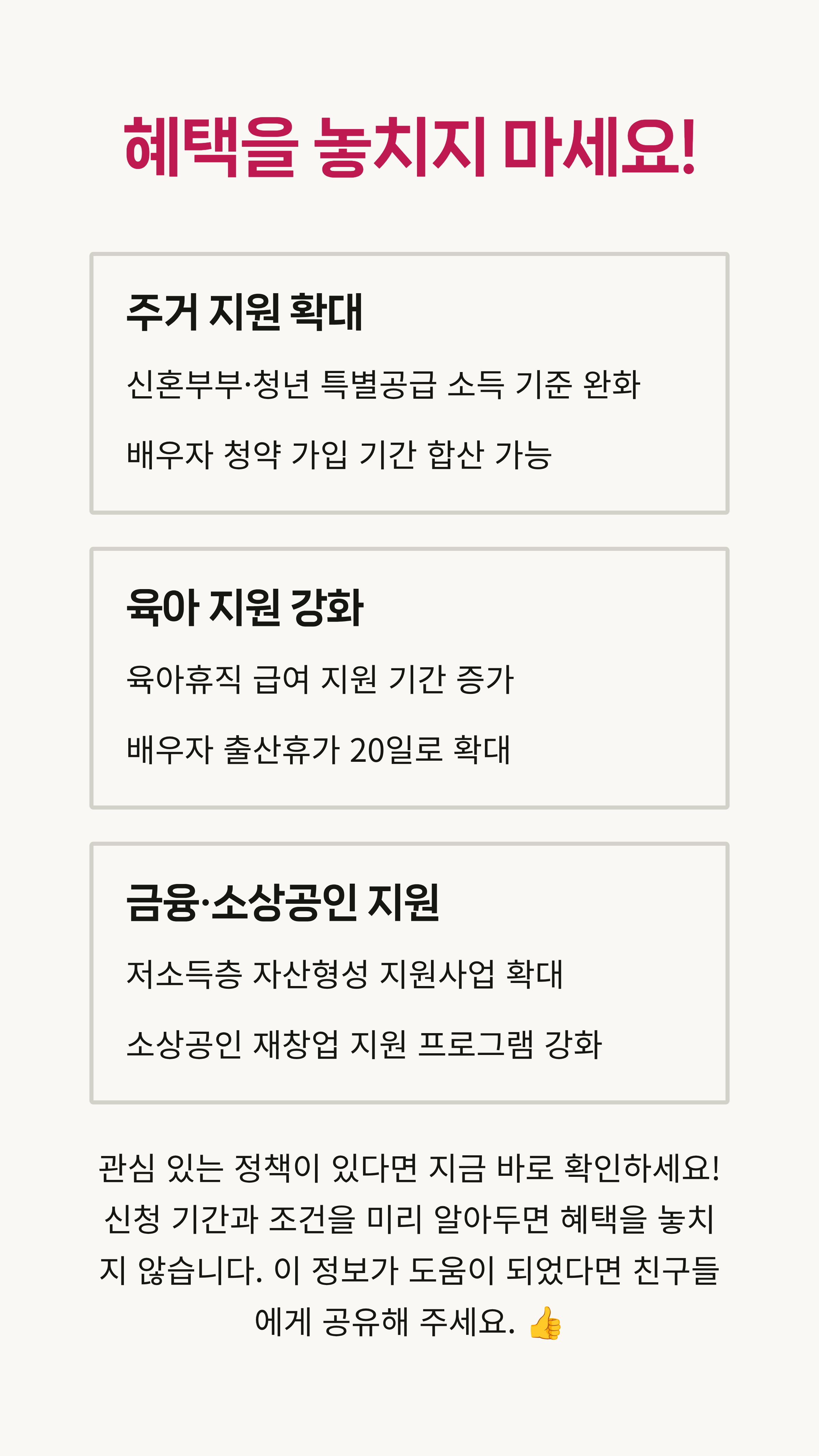 - 주거 지원: 신혼부부 및 청년 대상 특별공급 소득 기준 완화, 청약통장 가입 요건 확대