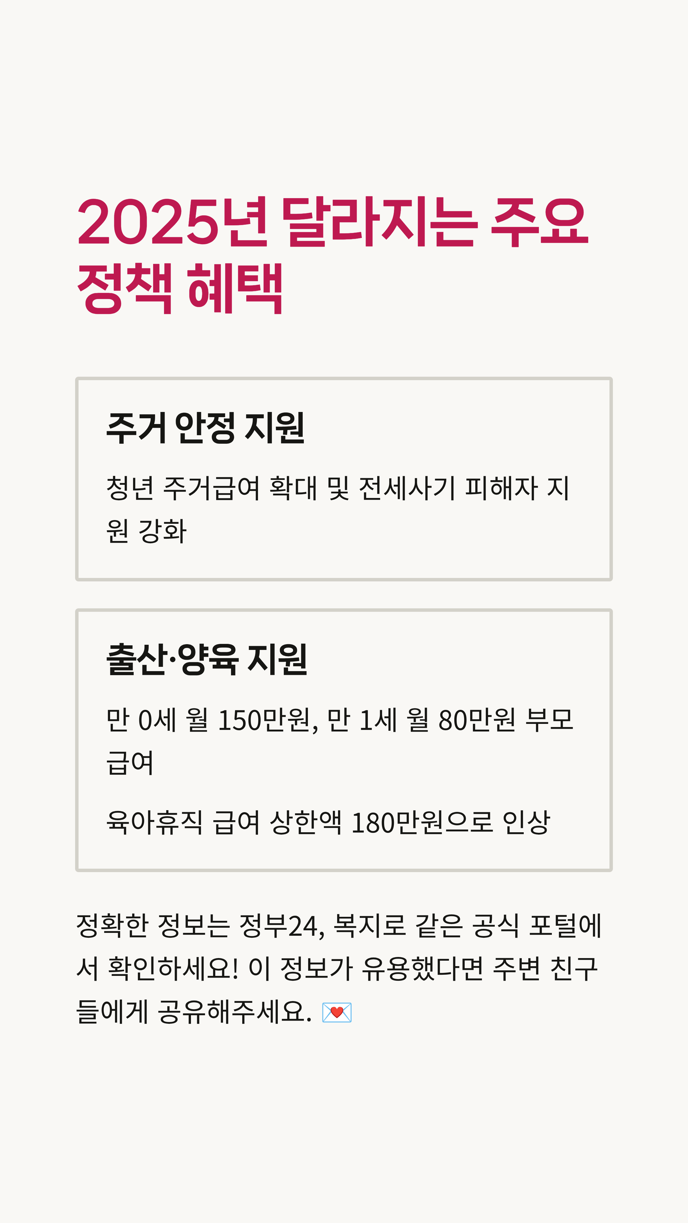 정부 정책은 매년, 그리고 수시로 바뀔 수 있어요. 따라서 항상 최신 정보를 확인하는 습관이 중요합니다. 오늘 제가 알려드린 내용이 여러분의 2025년을 준비하는 데 조금이나마 도움이 되었으면 좋겠네요. 더 궁금한 점이 있다면 언제든지 댓글로 남겨주세요! 😊