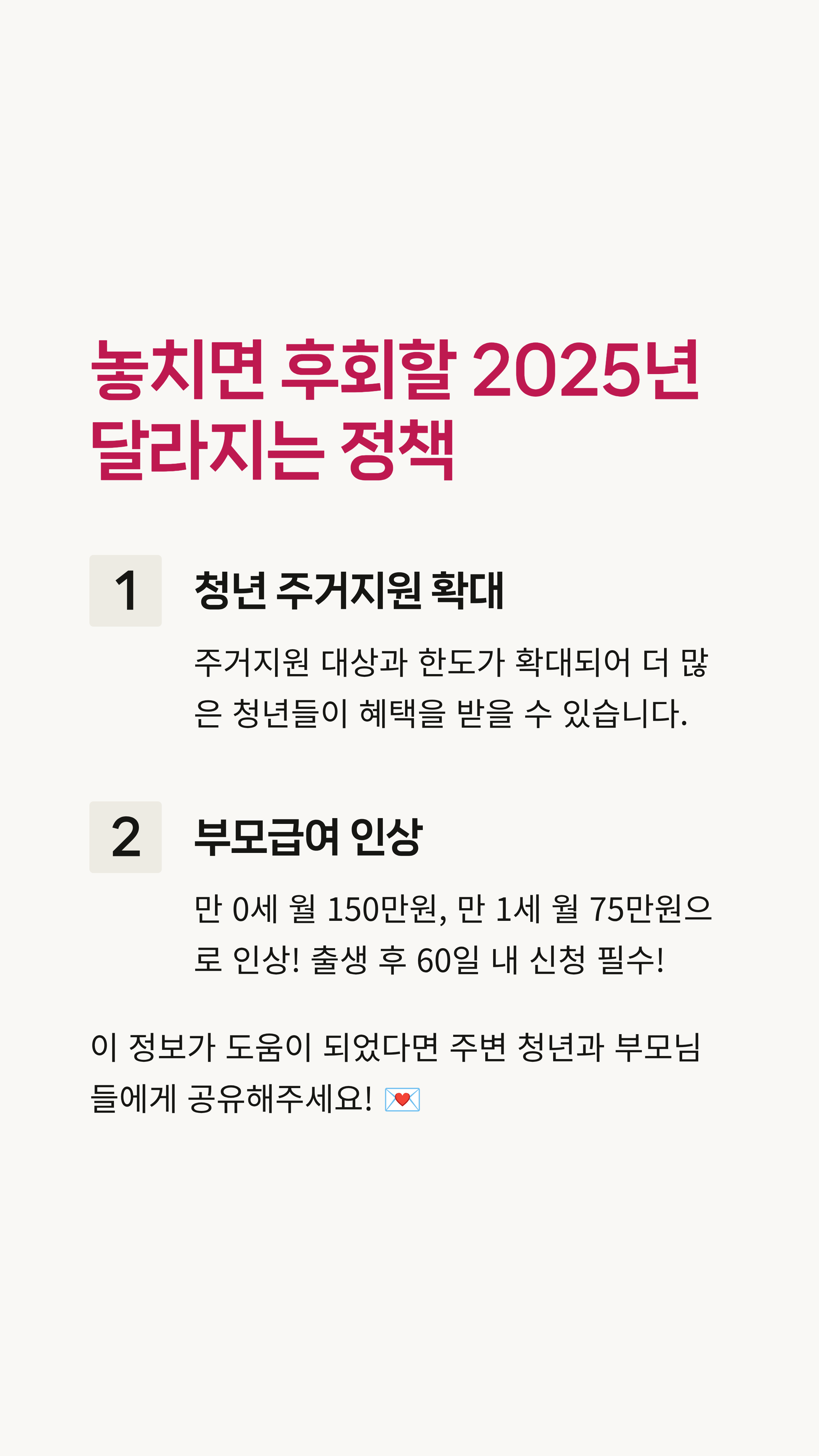 지금까지 2025년 달라지는 정책 5가지에 대해 알아봤어요. 복잡하게만 느껴지던 정책들이 조금은 쉽게 다가오셨으면 좋겠네요. 마지막으로 오늘 내용을 핵심만 콕콕 짚어 드릴게요!