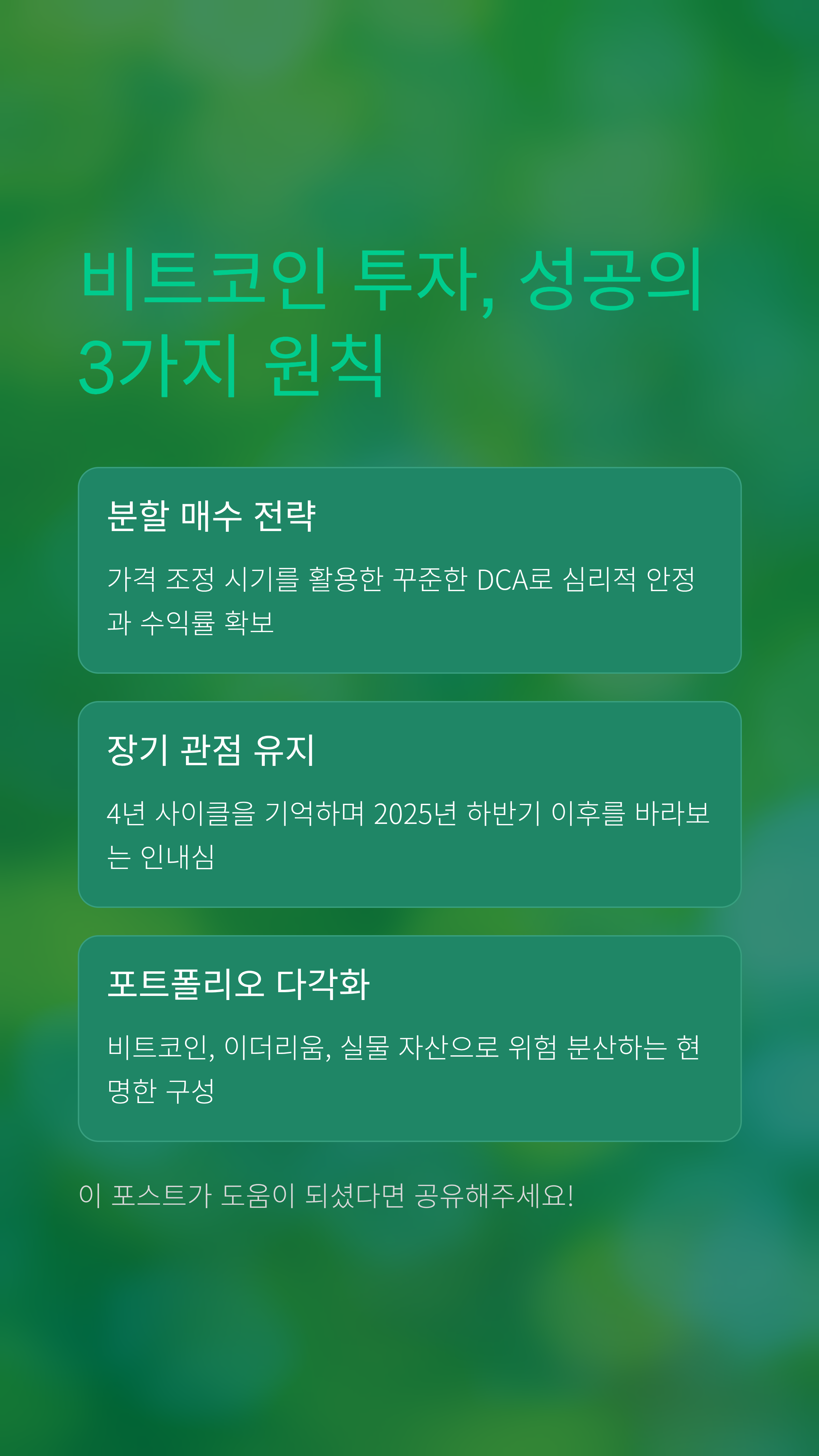 - 다섯 번째 핵심 포인트. 단기적 등락보다는 '4년 사이클'에 대한 믿음을 가지고 장기적인 관점에서 접근하는 것이 성공 투자의 핵심입니다.