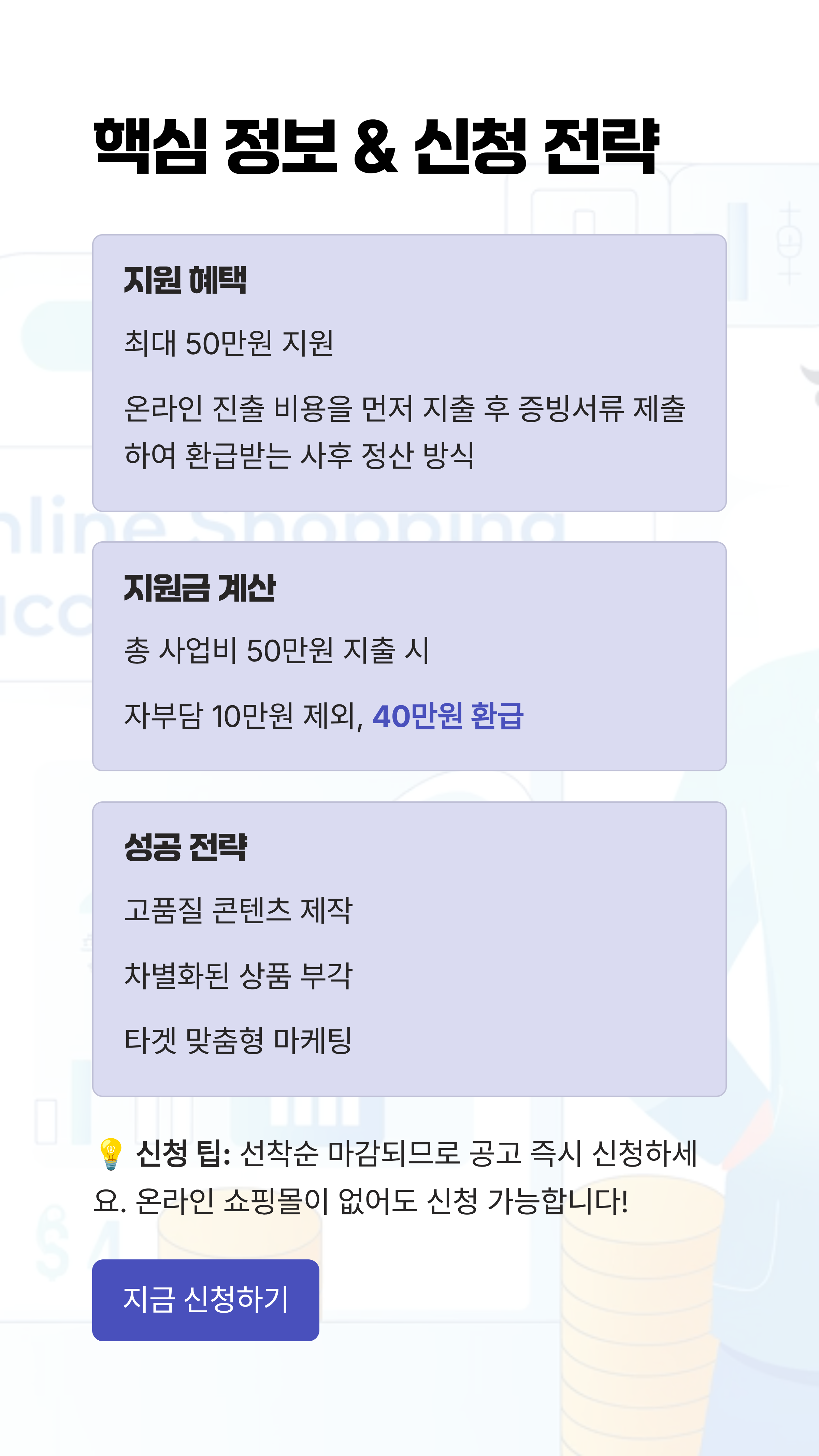 - 고품질 콘텐츠 필수. 지원금을 활용해 상세 페이지 등 온라인 콘텐츠 품질을 높이는 것이 성공의 핵심입니다.