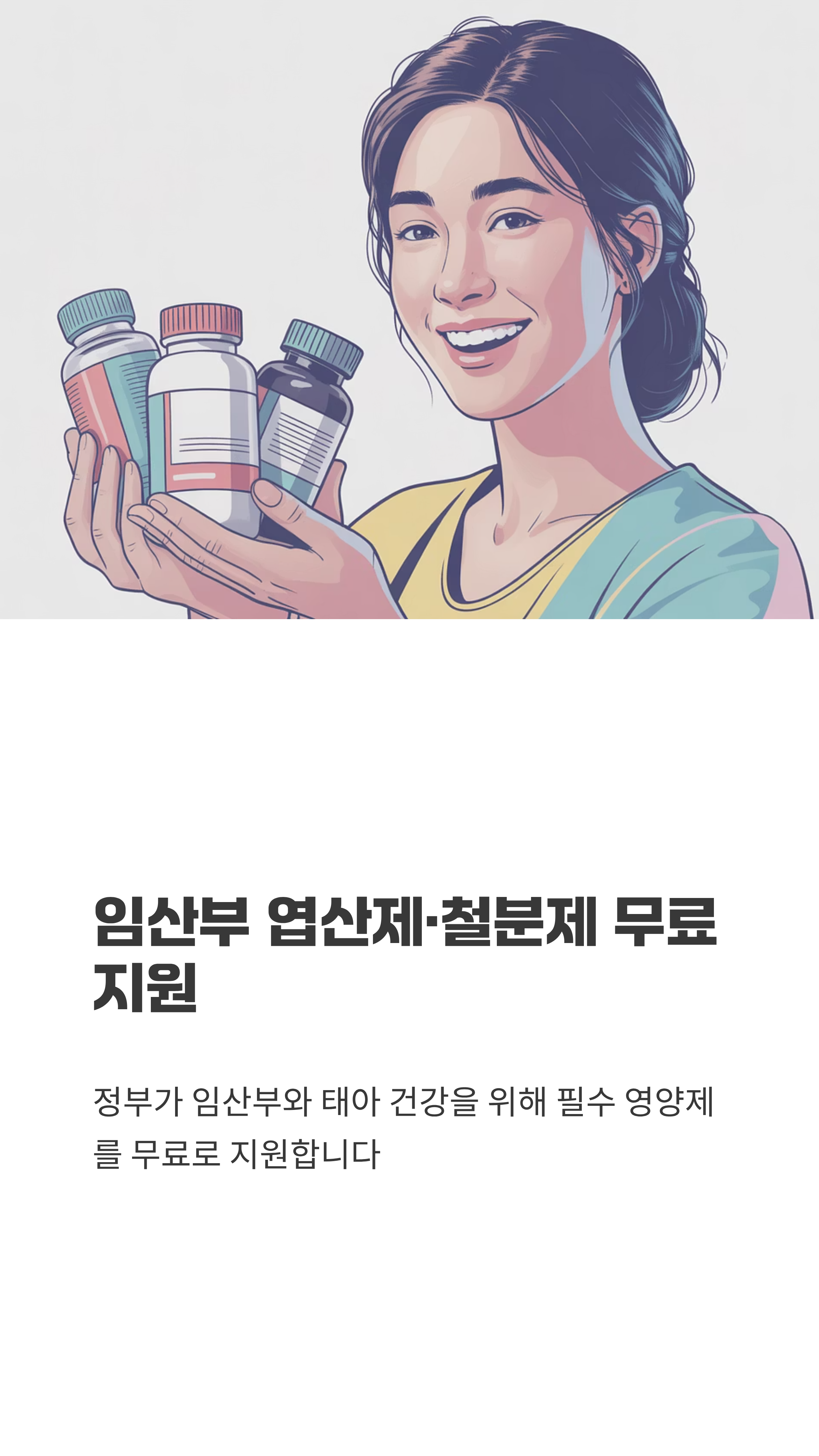 - **엽산제:** 임신 초기에 놓치지 않고 무료로 확보! 태아 신경관 발달에 집중할 수 있었어요.