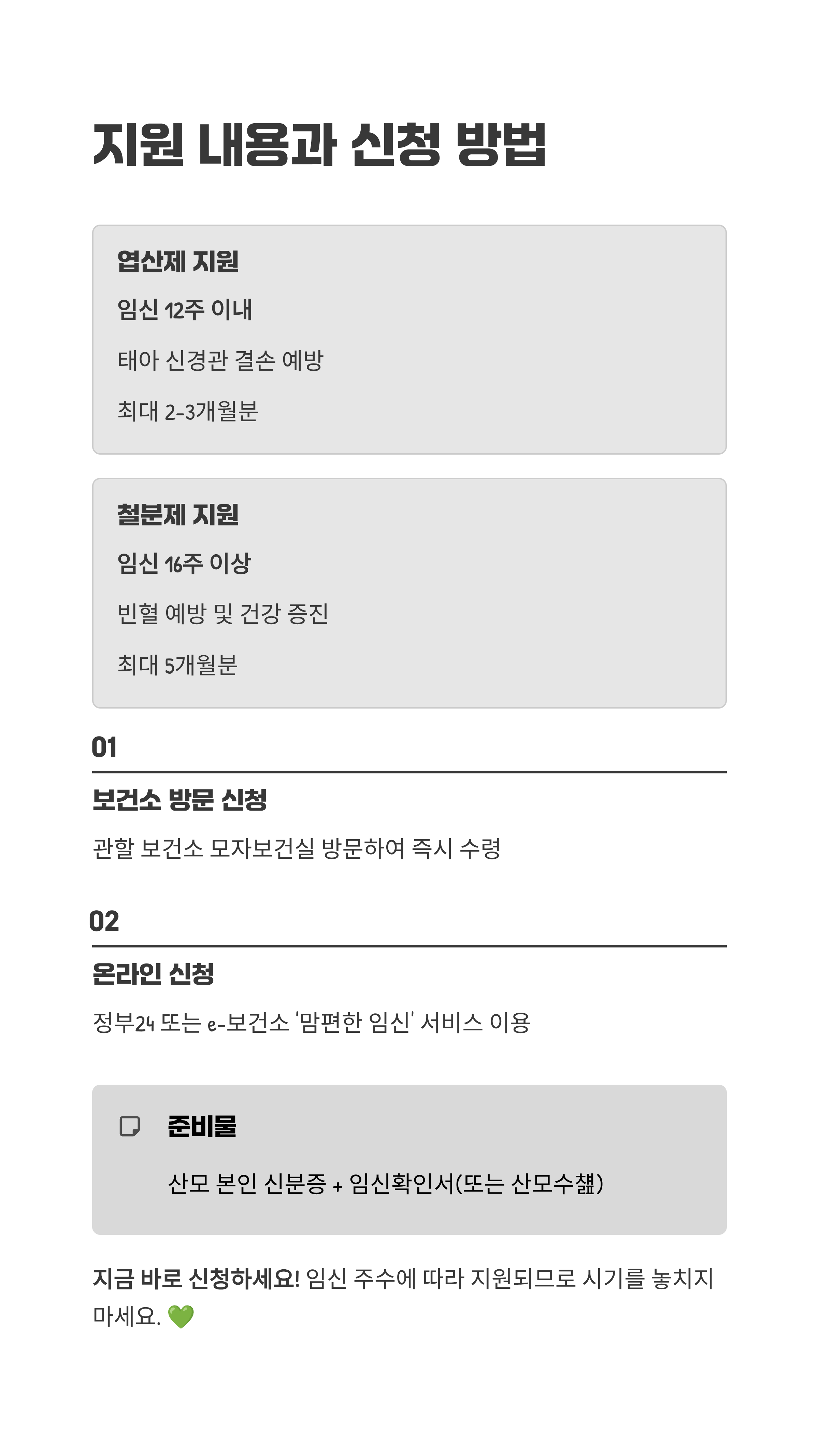 엽산제와 철분제 모두 **임신 주수에 따른 지원**이므로, 정해진 시기를 놓치면 소급 지원이 어렵다는 점을 꼭 기억하셔야 해요! 임신 확인 즉시 보건소에 등록하는 것이 가장 안전합니다.