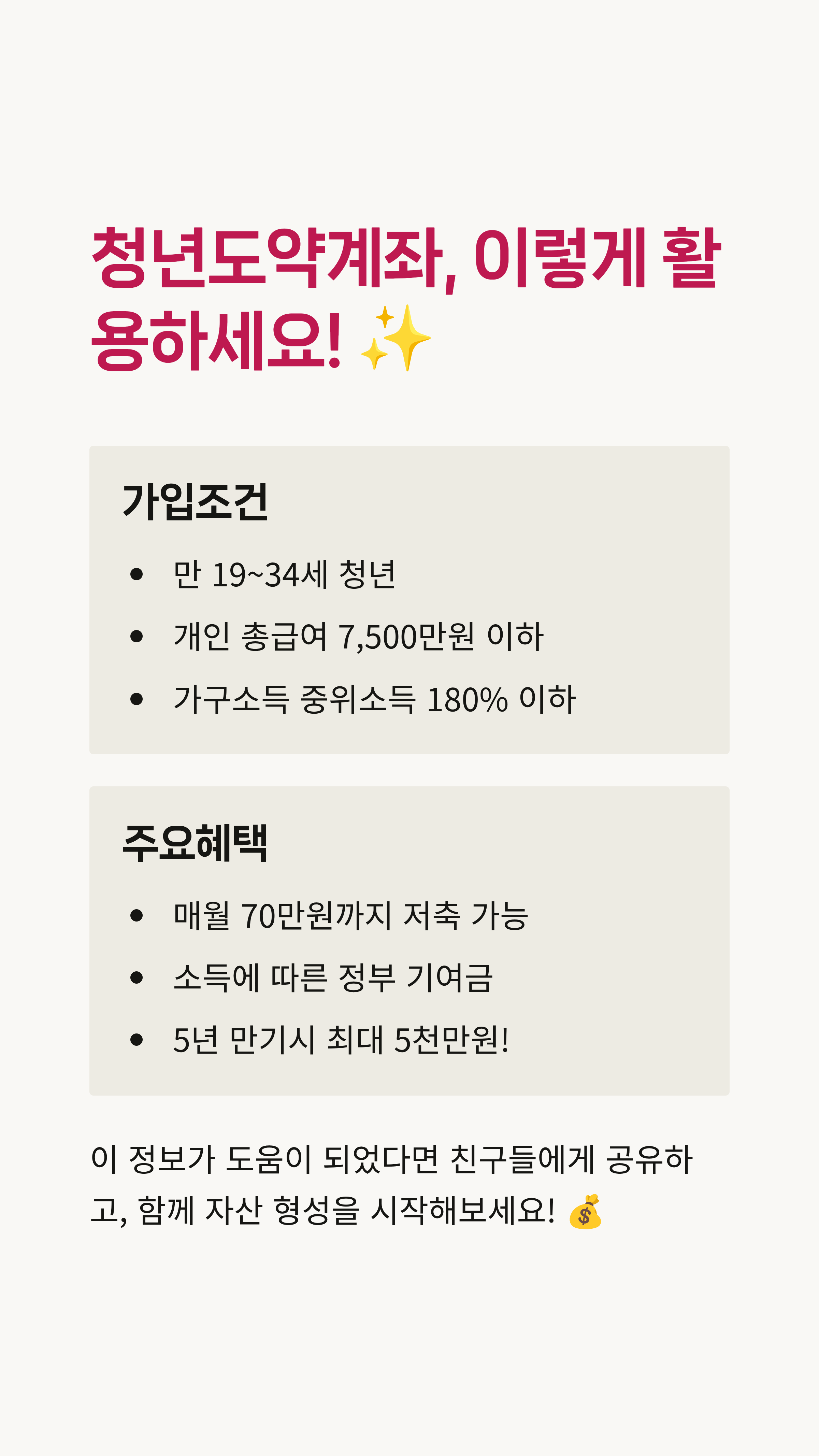 정말 많은 분들이 '언젠가 해야지' 하고 미루다가 좋은 기회를 놓치곤 하거든요. 이 글을 읽으신 여러분만큼은 목돈 마련의 꿈을 꼭 이룰 수 있도록 지금 바로 청년도약계좌 가입 조건을 확인해 보셨으면 좋겠어요. 궁금한 점은 언제든지 댓글로 물어봐주세요~ 😊