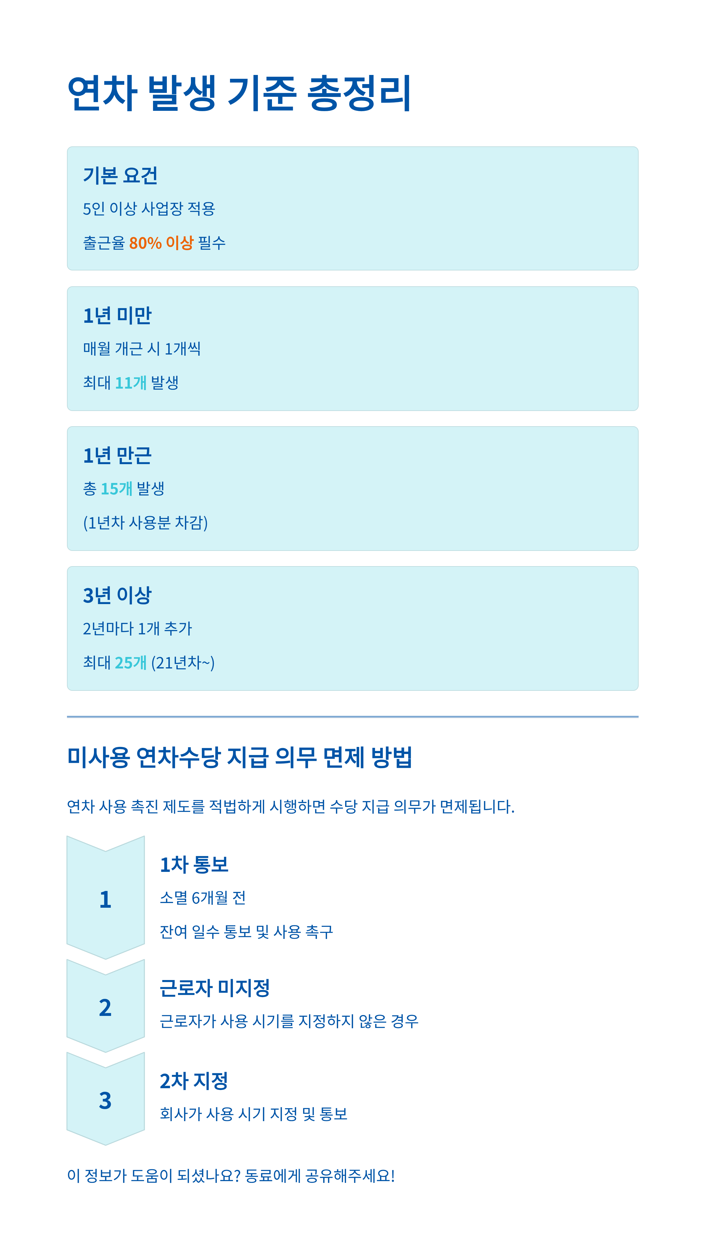 5. **다섯 번째 핵심 포인트.** 회사가 **연차 사용 촉진**을 했음에도 사용하지 않으면 **연차수당 지급 의무가 면제**될 수 있으니, 촉진 통보를 받으면 반드시 사용 계획을 제출하거나 연차를 사용해야 합니다.