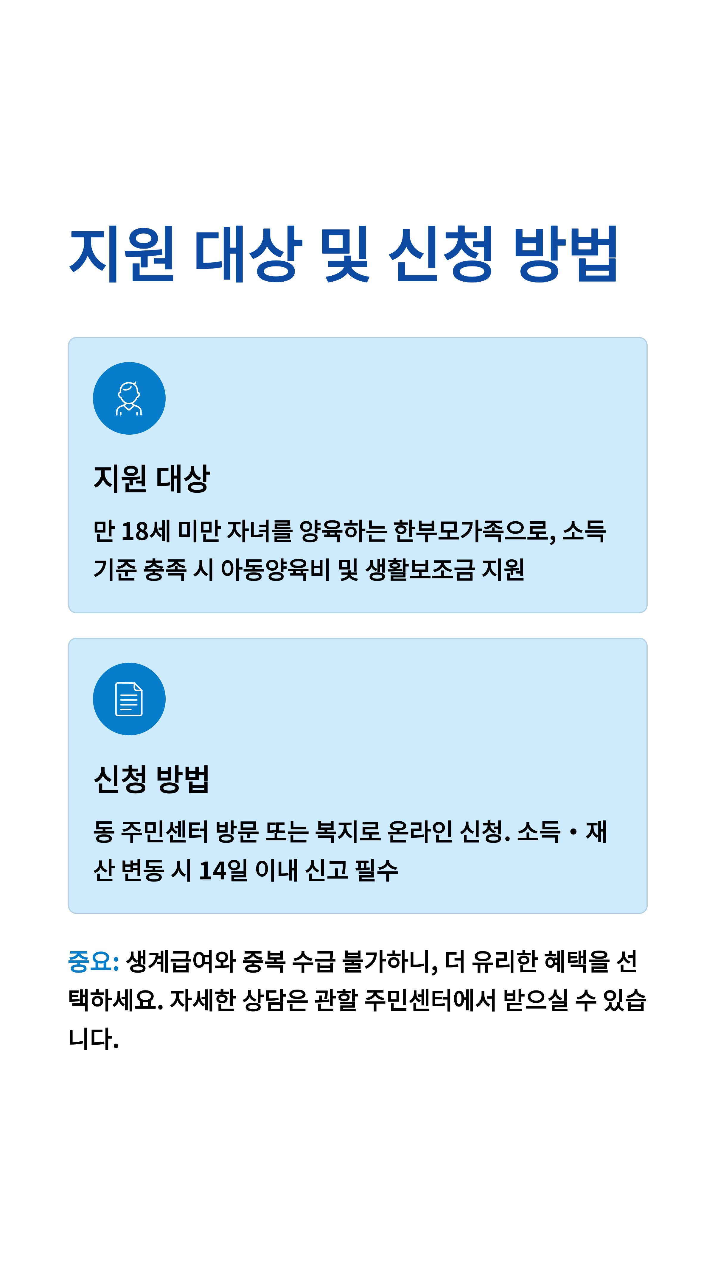- 첫 번째 핵심 포인트. 한부모가족 지원은 소득 및 재산 기준(중위소득 65% 이하)을 충족해야 합니다.