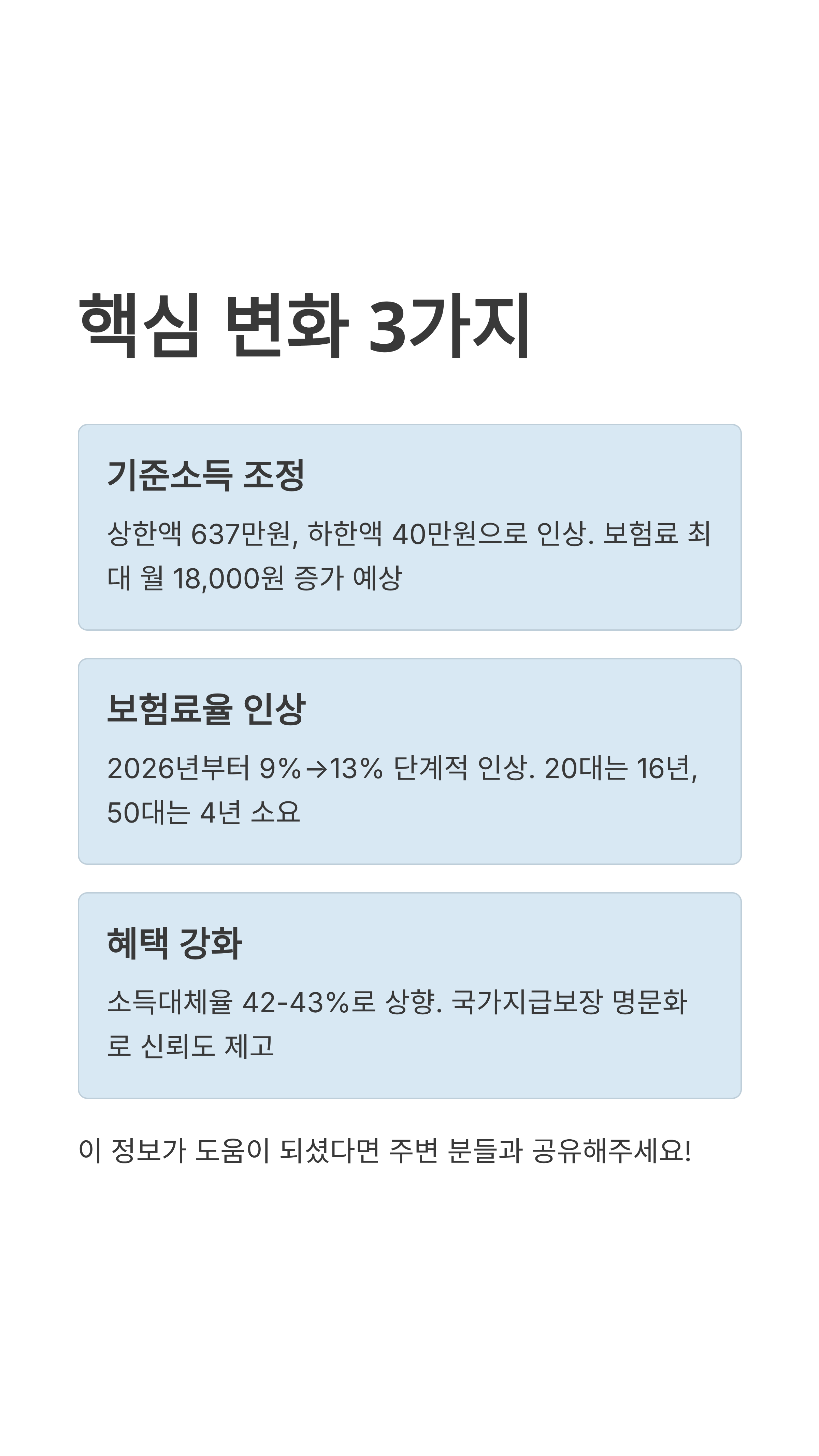 위 인상률은 정부 권고안 기준이며, 국회 논의 과정에서 소폭 조정될 수 있습니다. 또한 본인의 '기준소득월액'이 상한액을 초과하는 경우 인상 체감액이 더 커질 수 있어요.
