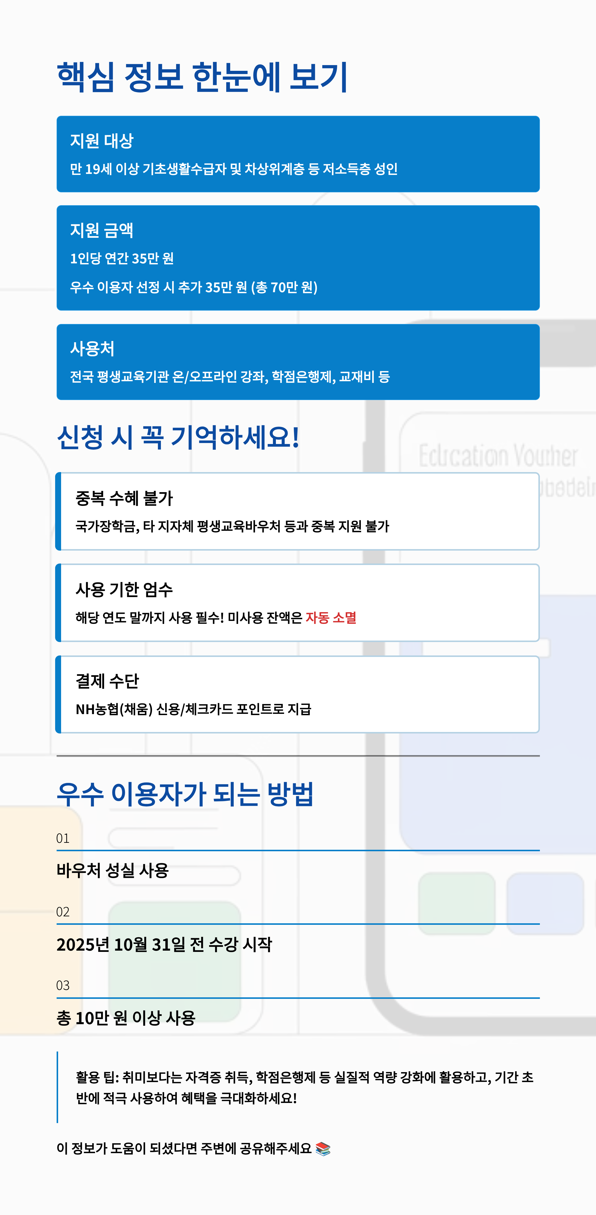 지금까지 2025년 평생교육바우처의 모든 것을 정리해봤어요. 여러분의 배움을 위한 이 소중한 기회를 놓치지 않도록 핵심 내용을 다시 한번 강조할게요.
