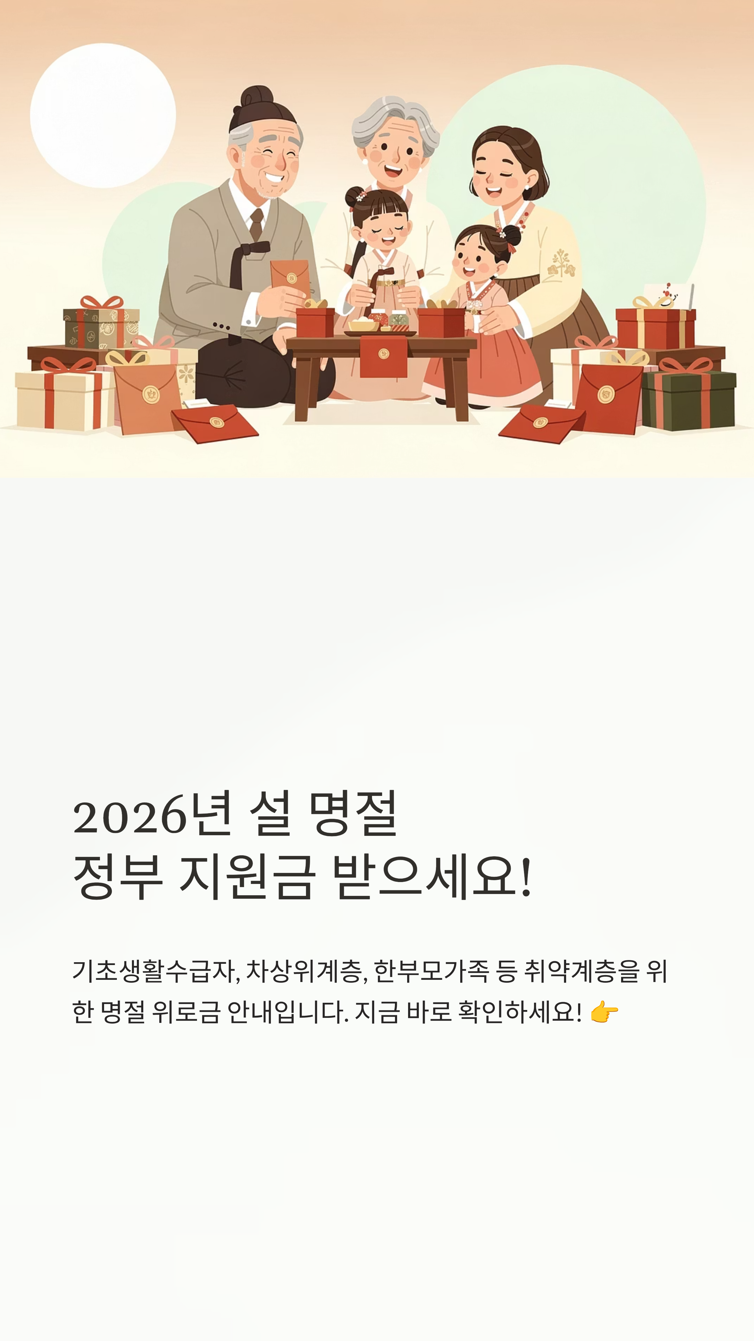 하지만 다행히 정부와 각 지자체에서는 취약계층과 소상공인 등을 위해 다양한 '명절 지원금'을 운영하고 있다는 사실, 알고 계셨나요? 의외로 본인이 대상인데도 몰라서 못 받는 경우가 정말 많더라고요. 그래서 오늘은 제가 여러분의 소중한 혜택을 찾아드리기 위해 신청 대상과 방법을 꼼꼼하게 정리해 왔습니다. 끝까지 읽어보시고 꼭 챙겨가세요! 😊