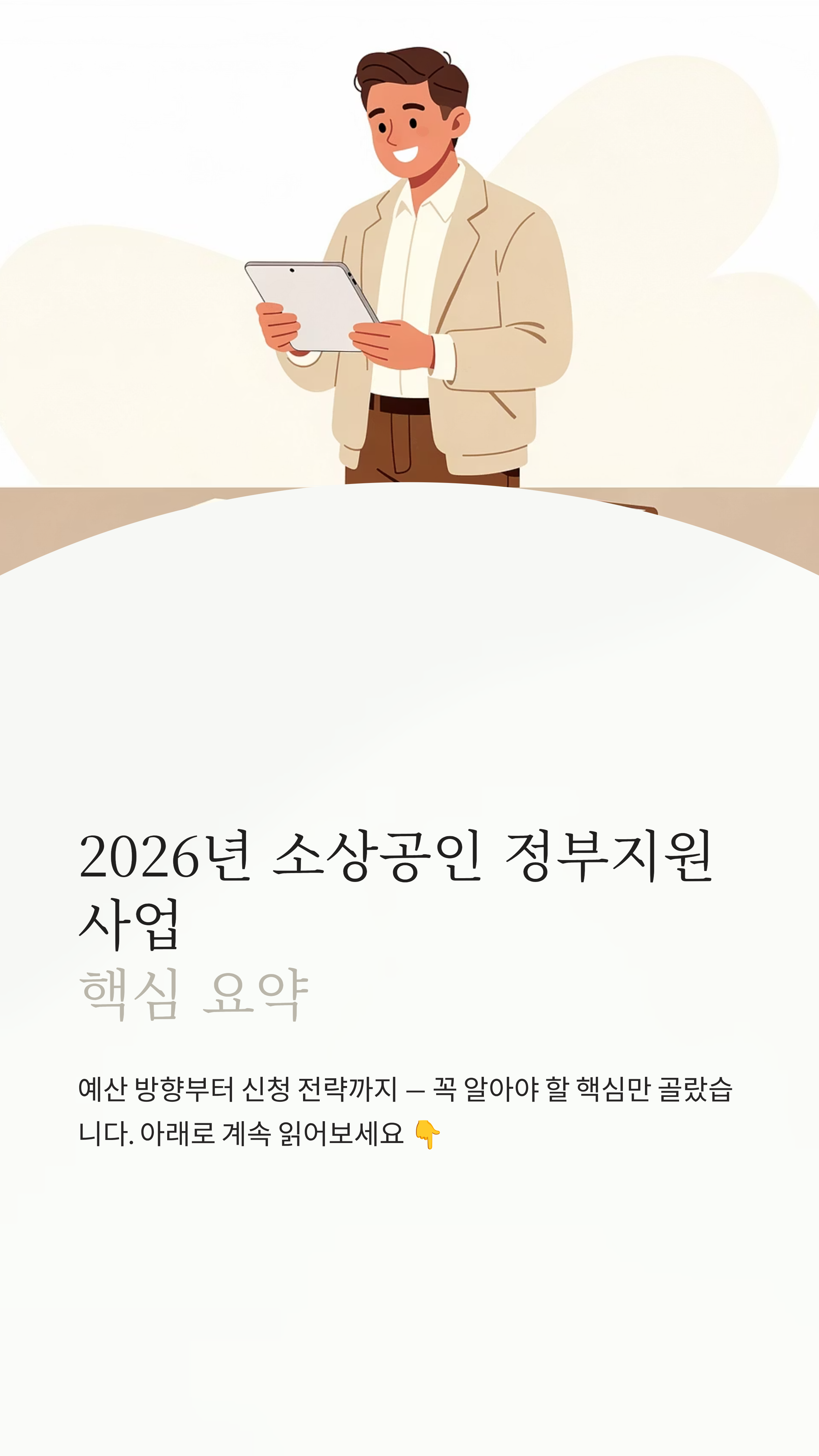 하지만 하늘이 무너져도 솟아날 구멍은 있다고 하잖아요! 정부에서는 2026년에도 우리 소상공인분들을 위해 꽤나 큼직한 예산을 편성했답니다. "알면 받고 모르면 못 받는" 게 바로 정부지원금이죠. 오늘 제가 2026년 소상공인 지원 사업의 핵심만 쏙쏙 뽑아서 정리해 드릴 테니, 끝까지 읽어보시고 꼭 혜택 챙겨가셨으면 좋겠어요. 😊