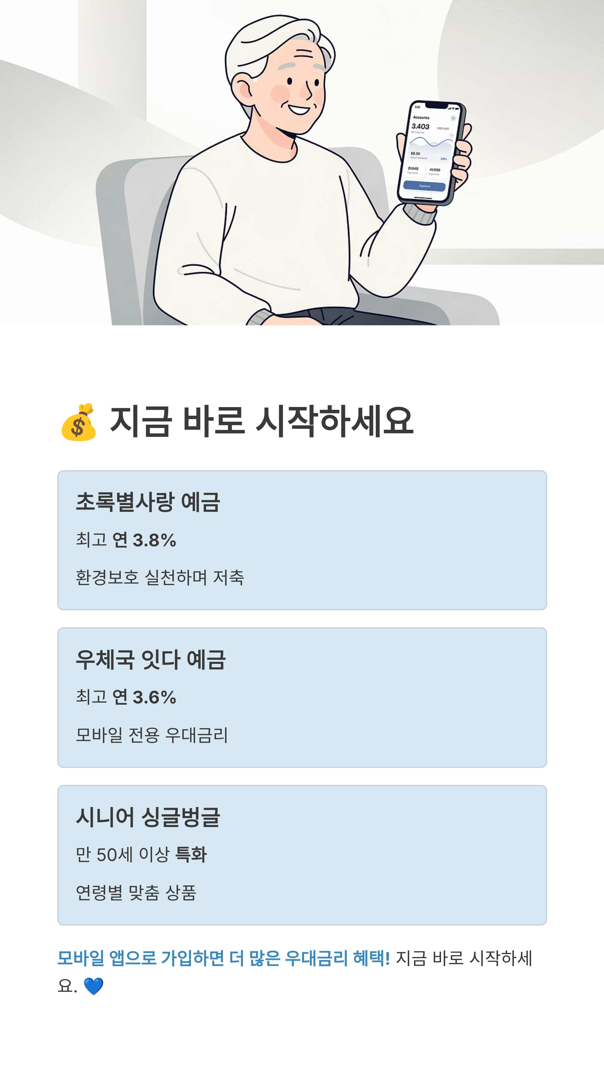 | 시니어 싱글벙글 예금 | 연 3.5% | 1년~3년 | 만 50세 이상 우대 |
