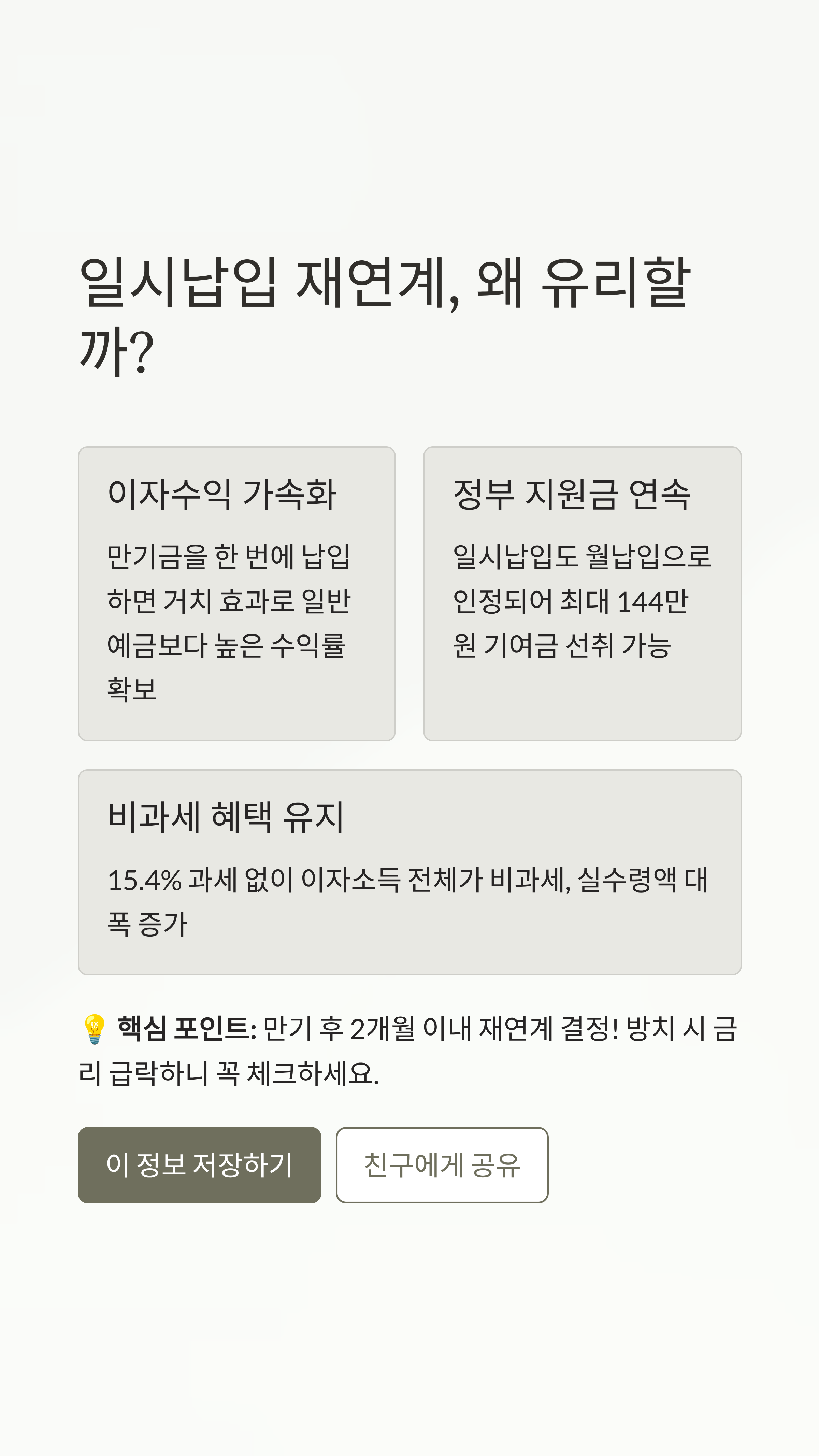 - 만기 직후 행동이 중요! 방치하면 이율이 뚝 떨어지니 미리 재연계 여부를 결정하세요.