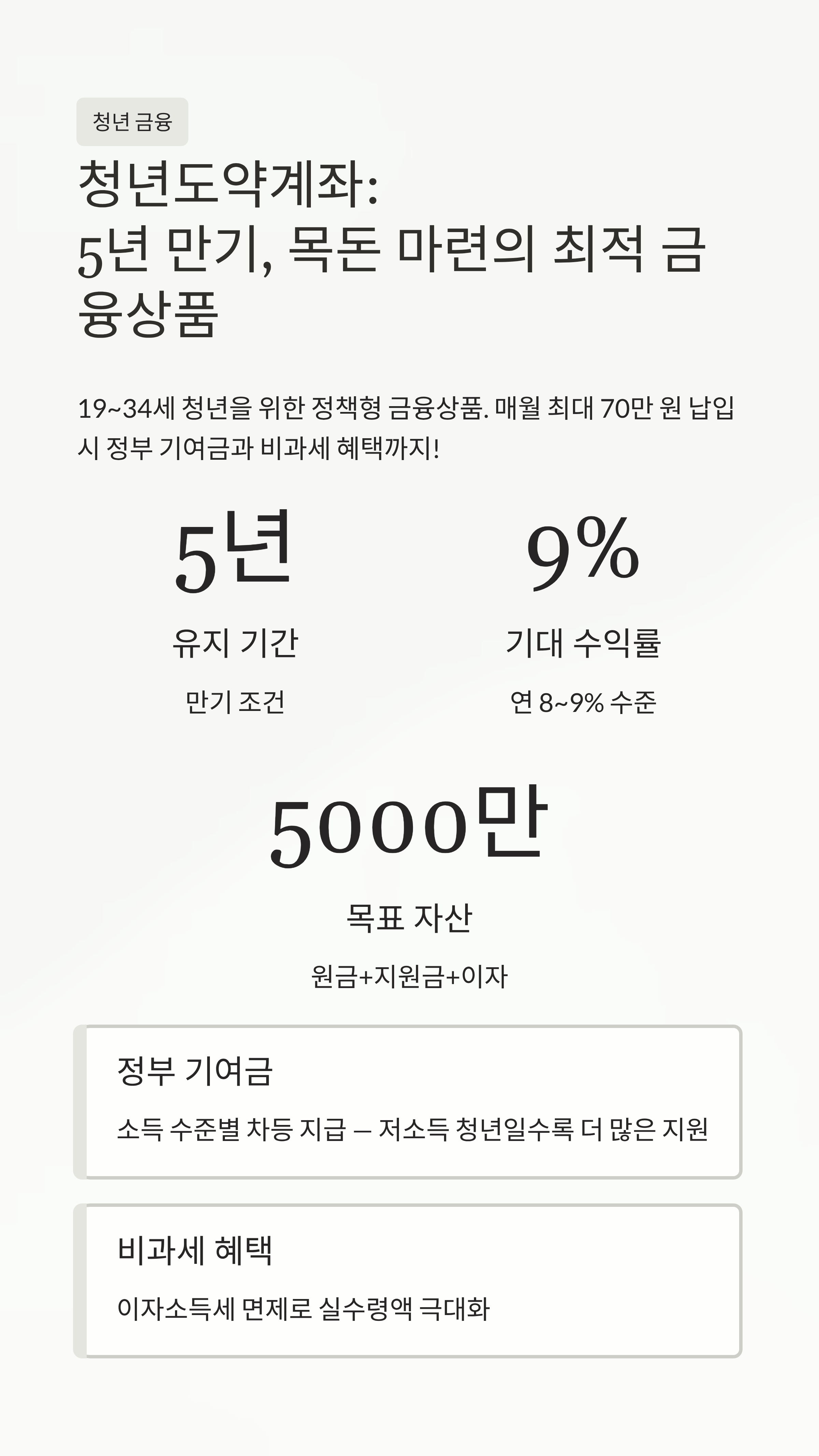 - 무조건 5년 만기를 채우세요. 비과세와 정부 지원금은 오직 만기 시에만 온전히 내 것이 됩니다.