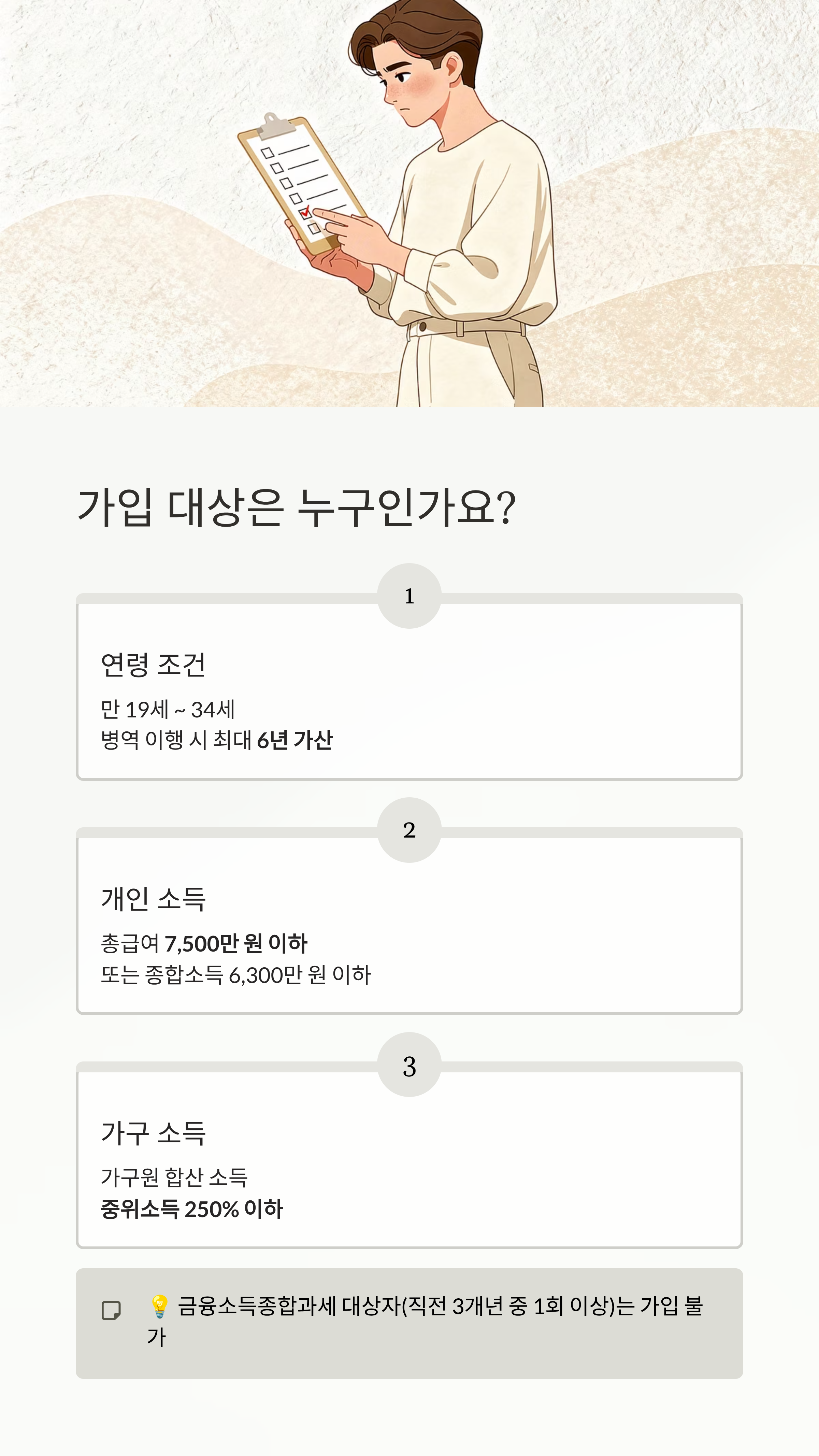 누구나 가입할 수 있다면 좋겠지만, 정책 상품이다 보니 나이와 소득에 일정한 기준이 있어요. 내가 아래 조건에 해당되는지 체크리스트처럼 확인해 보세요.