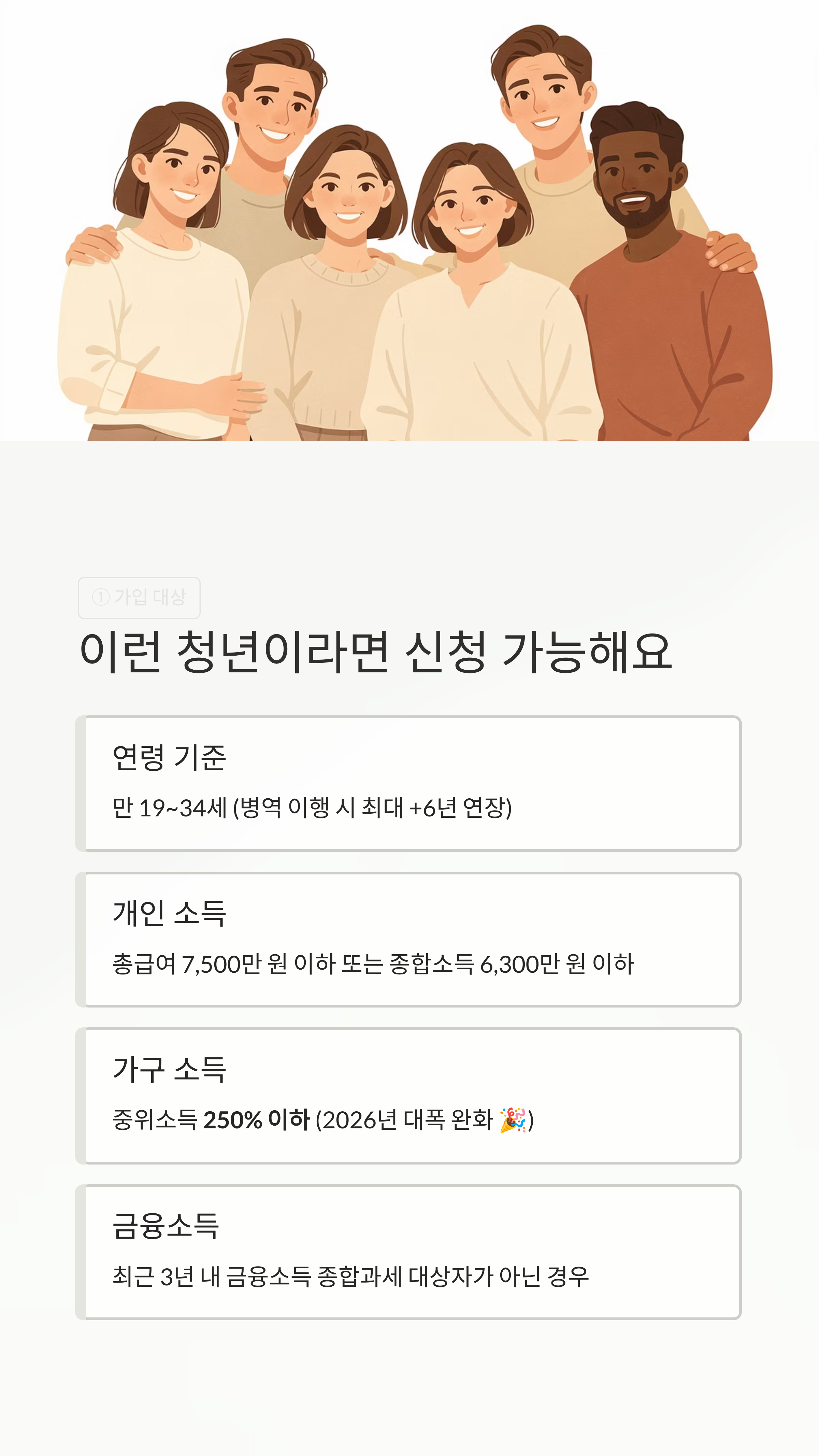 ✨ 가입 조건: 만 19~34세, 가구 소득 250% 이하로 문턱이 낮아졌어요.