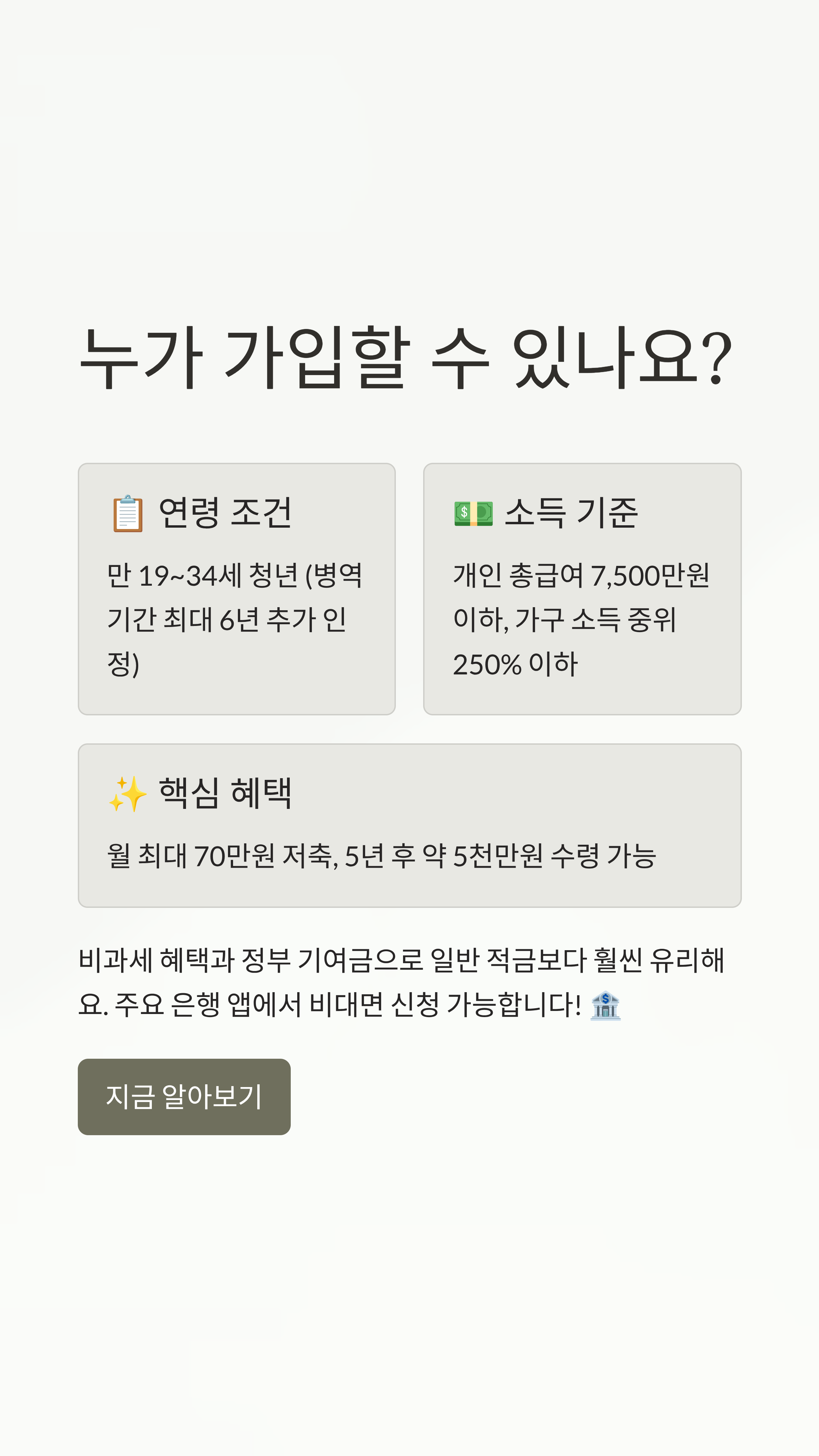 아쉽지만 모든 분이 가입할 수 있는 건 아니에요. 나이와 소득 기준을 충족해야 하는데요, 2026년 기준으로 정리해 드릴게요. 나이 기준은 만 19세부터 34세까지입니다. (병역 이행 기간은 최대 6년까지 인정되어 40세도 가능할 수 있어요!)
