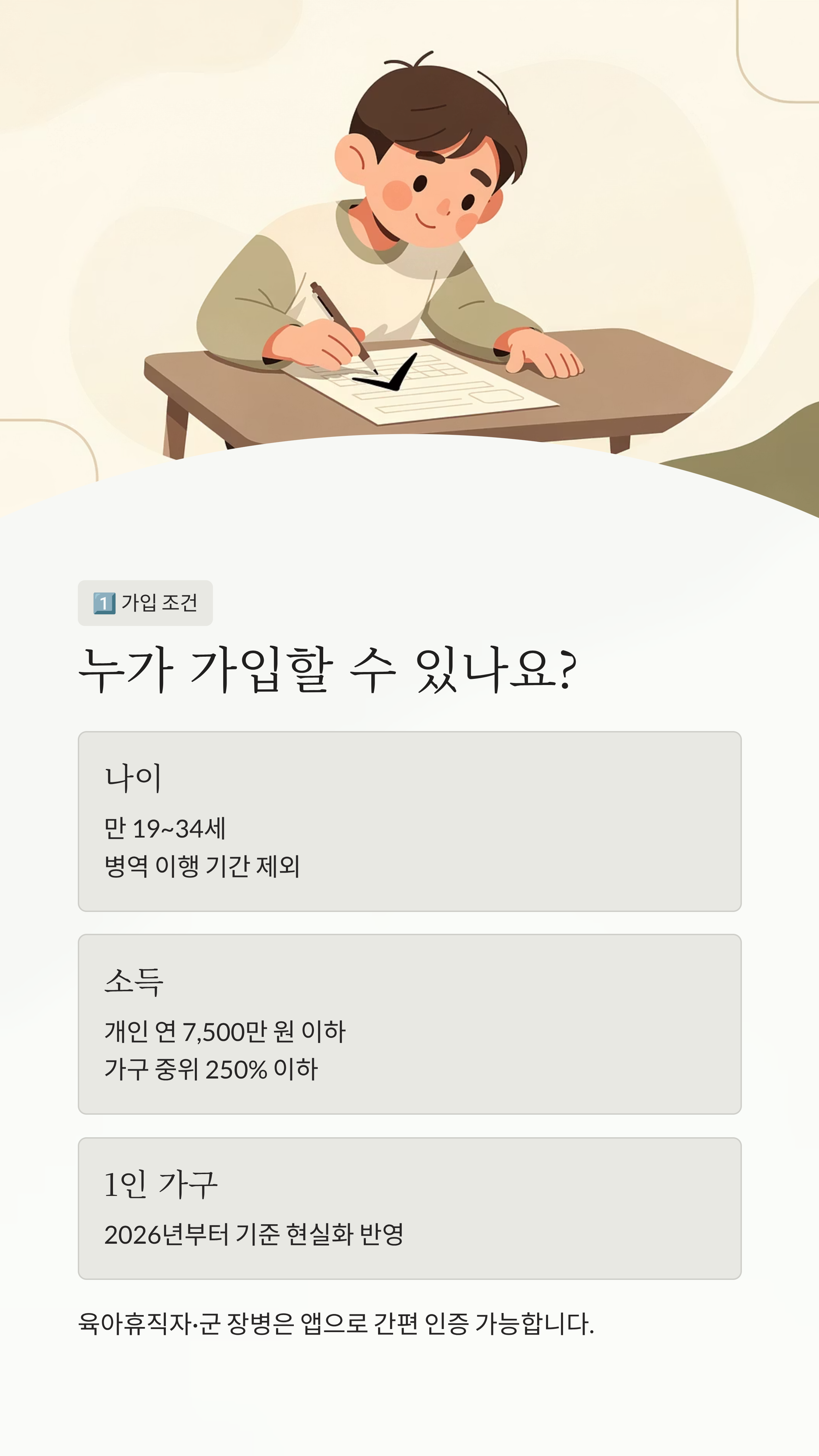 가장 먼저 확인해야 할 건 역시 '내가 가입할 수 있느냐'겠죠? 올해부터는 더 많은 청년이 혜택을 볼 수 있도록 문턱이 살짝 낮아졌어요. 기존에는 가구 소득 기준이 상당히 까다로웠는데, 1인 가구 비중이 늘어남에 따라 이 부분이 현실적으로 조정되었답니다.