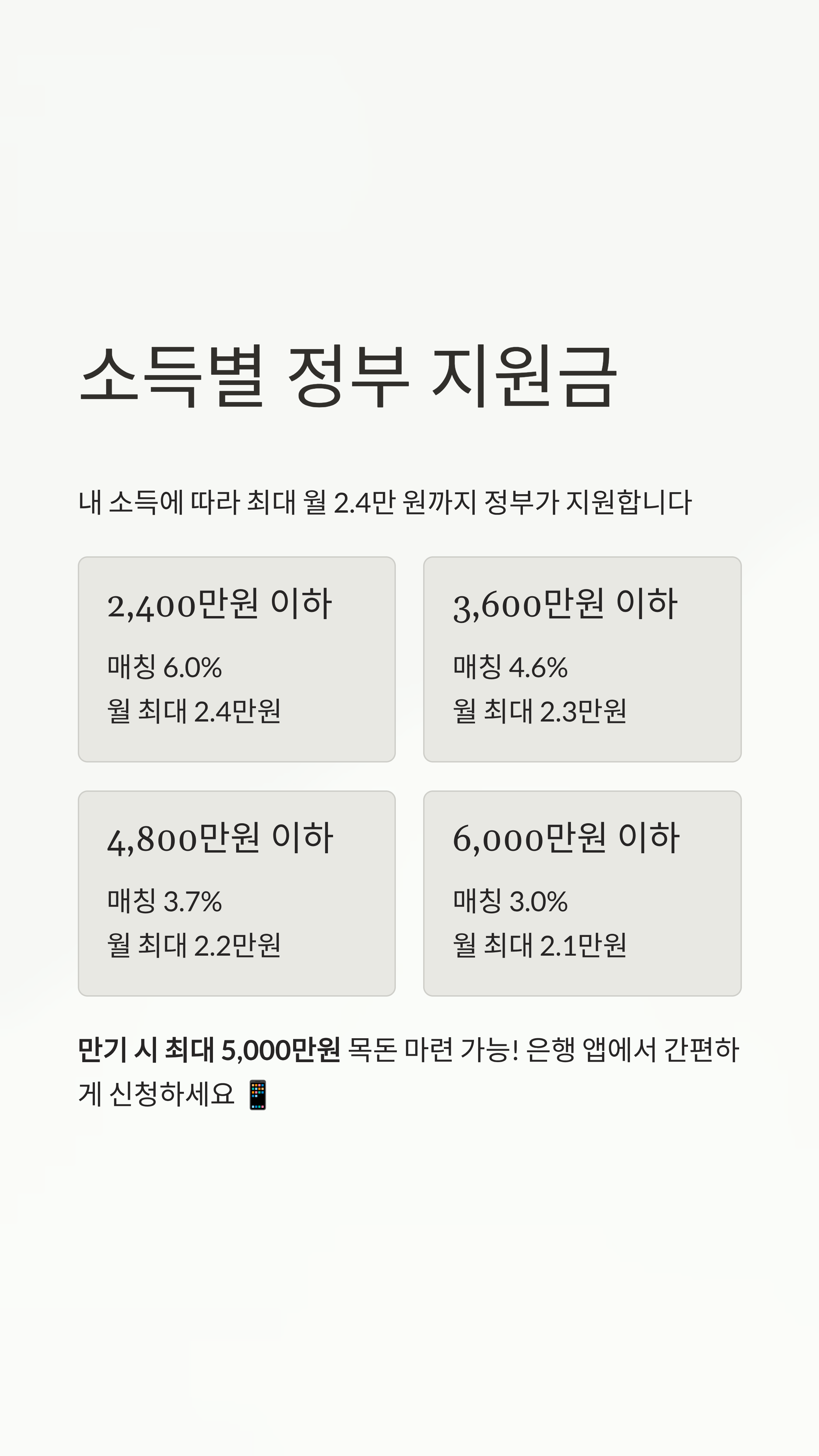 내가 얼마나 넣으면 정부가 얼마를 줄까요? 이 부분이 가장 궁금하실 텐데요. 개인 소득 수준에 따라 매칭 비율이 조금씩 다릅니다. 저소득 구간일수록 정부가 더 많은 기여금을 얹어주는 구조예요.