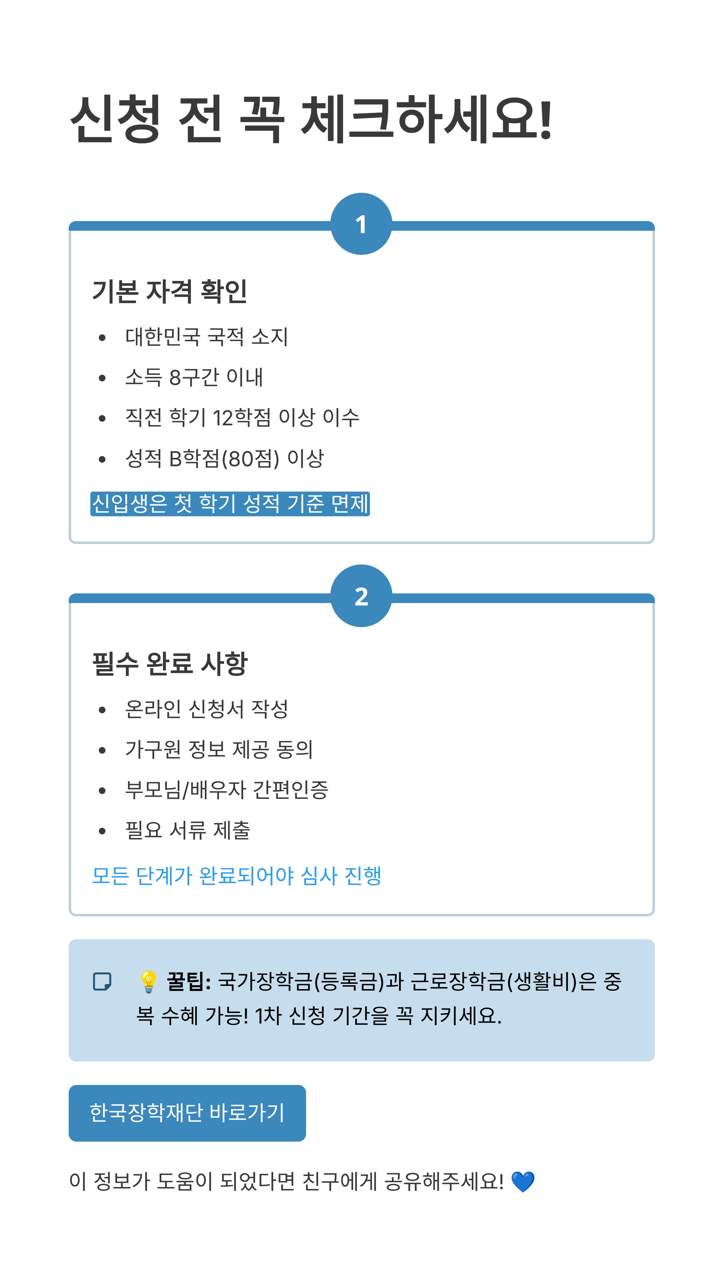- 중복 지원 확인. 국가장학금 외에도 지자체나 교내 장학금과 중복 수혜가 가능한지 체크하세요.
