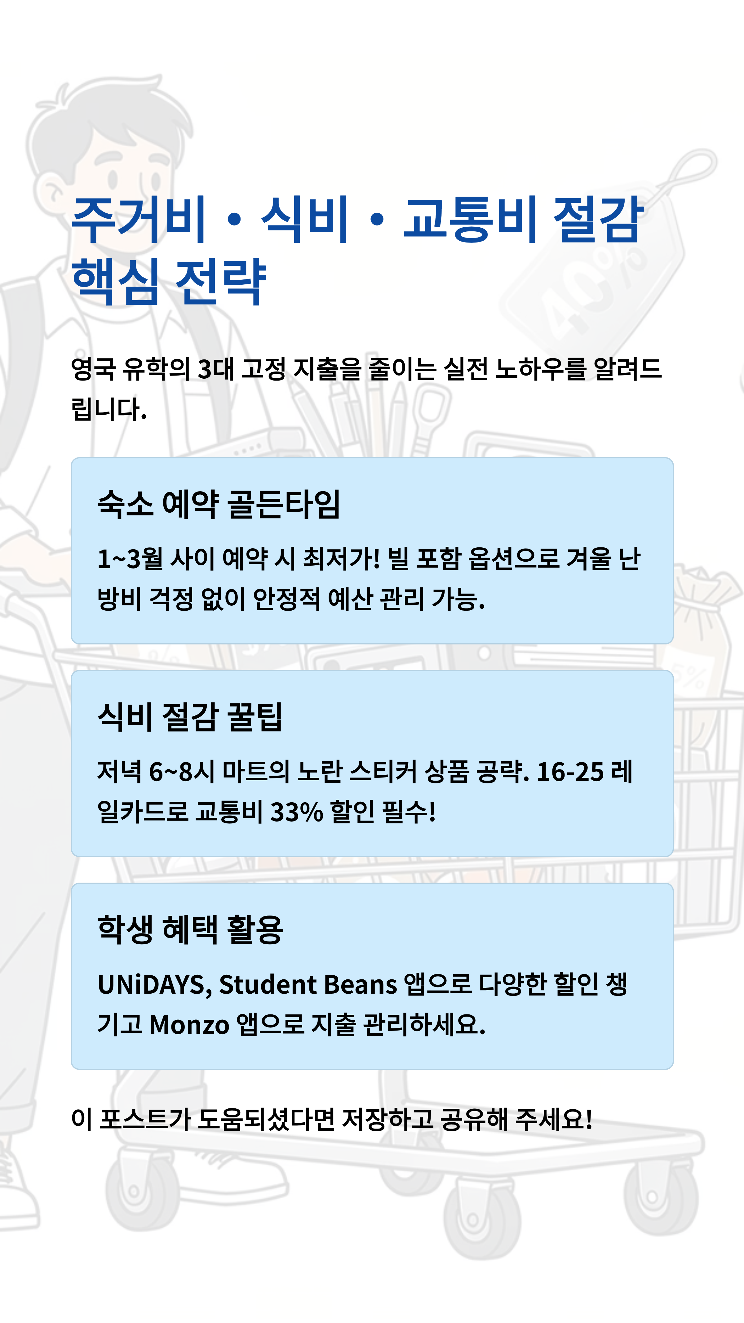 신사들의 나라 영국! 하지만 유학생들에게 영국은 '살인적인 물가의 나라'로 더 잘 알려져 있죠. 특히 최근 가파르게 오른 환율과 물가 때문에 2026년 입학을 앞둔 분들의 고민이 이만저만이 아닐 거예요. 저도 처음 영국에 도착했을 때 샌드위치 하나 가격을 보고 손을 떨었던 기억이 나네요. 하지만 걱정 마세요! 정보만 제대로 알고 있으면 영국은 학생들에게 정말 관대한 나라거든요. 오늘은 제가 현지에서 직접 몸으로 부딪히며 배운 영국 생활비 절약 노하우를 아낌없이 공유해 드릴게요! 🇬🇧✨