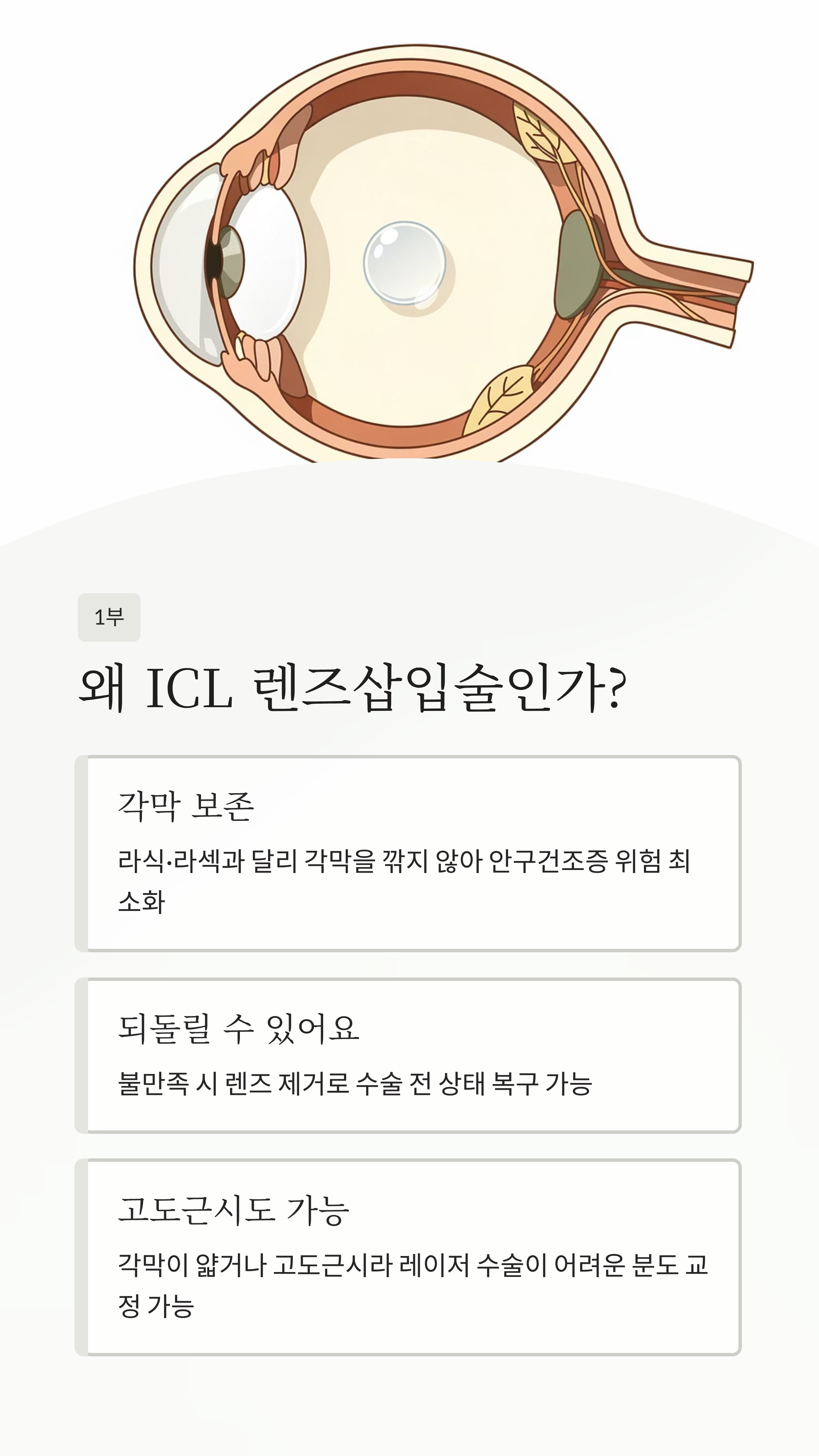 먼저 ICL이 뭔지부터 간단히 짚고 넘어갈게요. ICL(Implantable Contact Lens)은 말 그대로 눈 안에 특수 렌즈를 삽입하는 수술이에요. 각막을 깎아내는 라식이나 라섹과는 완전히 다른 방식이죠. 각막을 보존하기 때문에 안구건조증 발생 위험이 적고, 나중에 문제가 생기면 렌즈를 제거해 다시 원래 상태로 돌릴 수 있다는 게 엄청난 장점이에요.