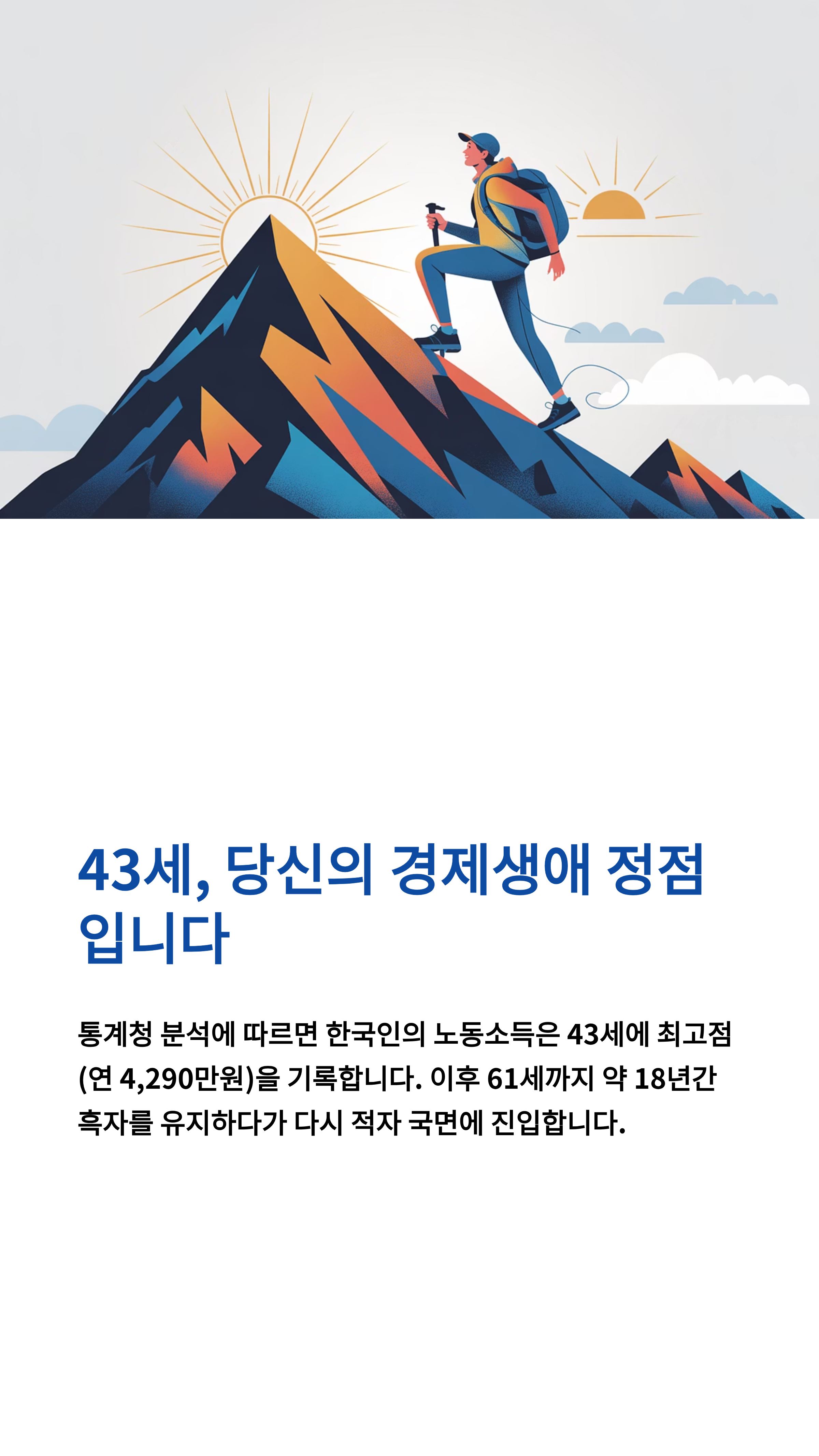 혹시 뉴스에서 **'한국인의 노동소득, 43세에 정점을 찍고 61세부터 생애 적자 구간에 재진입한다'**는 통계청 발표를 보셨나요? 이 숫자들이 저만 충격적인가요? 우리가 한창 돈을 많이 벌 때라고 생각했던 시기가 40대 초반이고, 생각보다 이른 나이인 61세부터 다시 적자 인생을 시작하게 된다는 건 정말 현실적인 문제입니다. 특히 17세(고등학교 시기)에 교육비 지출 등으로 최대 적자(약 4,078만원)를 기록하고, 이후 28세부터 흑자 구간에 진입했다가 43세에 흑자 정점(약 1,753만원)을 찍고 내려오죠. 이젠 '정년 연장'이니 '계속 근로'니 하는 이야기가 단순한 희망이 아니라, **생존의 문제**가 되어버린 거죠. 이 글을 끝까지 읽으시면, 이 통계가 우리 삶에 어떤 영향을 미치는지 구체적으로 파악하고, **43세부터 61세까지의 '황금 흑자 기간'을 어떻게 효율적으로 관리해서** 적자 시기를 늦추고 풍요로운 노후를 만들 수 있는지 그 방법을 확실히 알려드릴게요! 😊